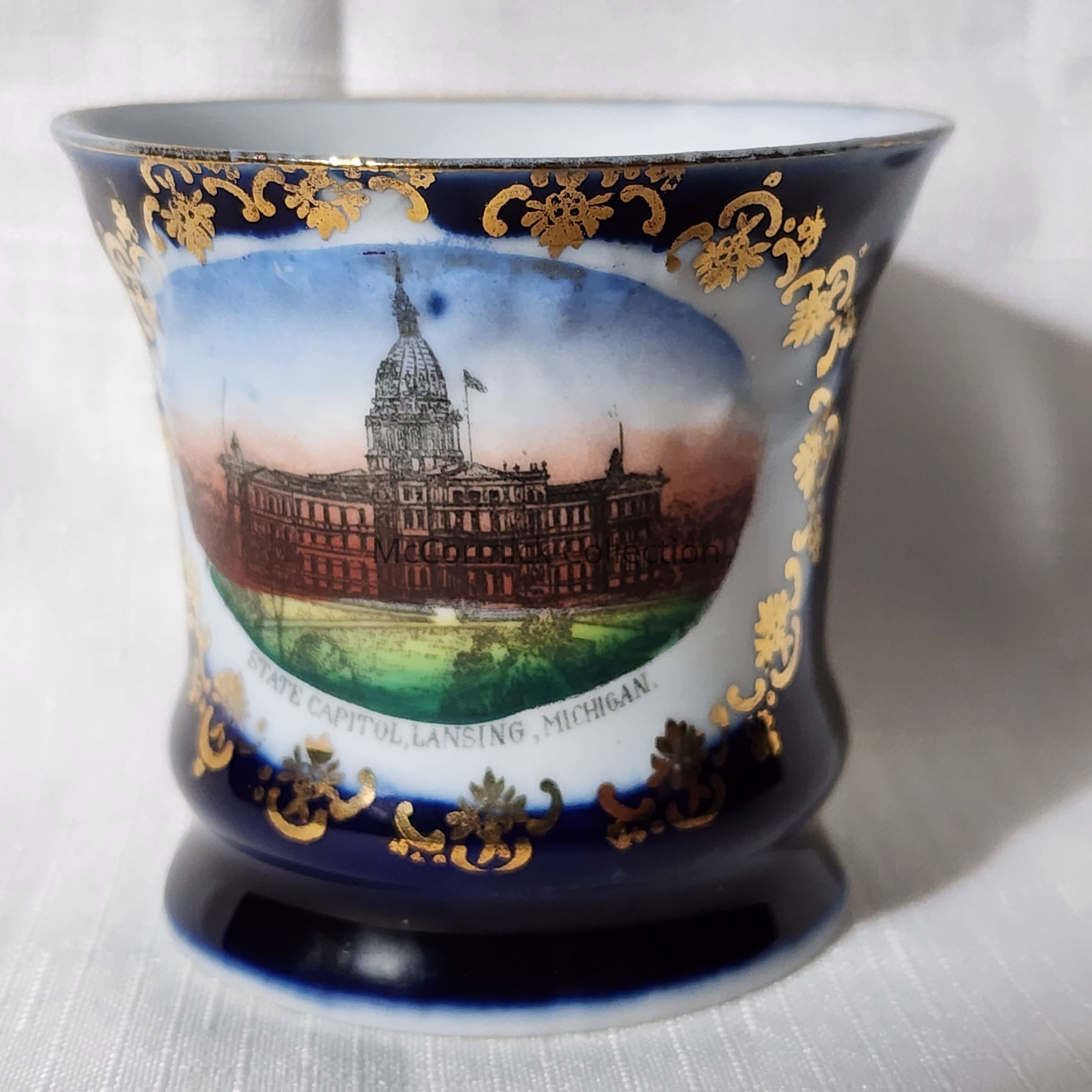 Porcelain souvenir cup with lithophane bottom of the Michigan State Capitol, made in Germany expressly for H.H. Larned of Lansing.