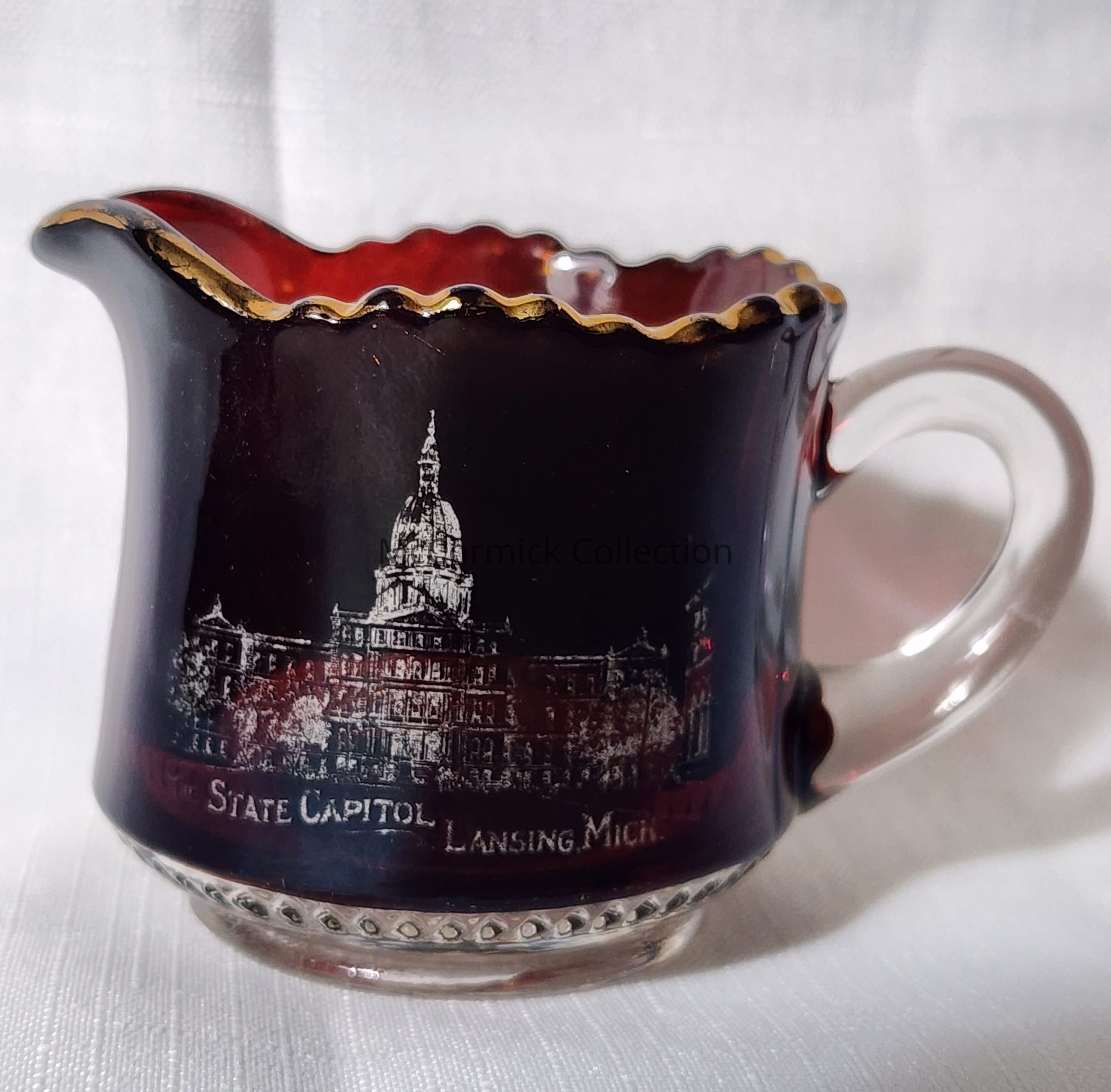 Michigan State Capitol ruby red flashed souvenir creamer. From a pair of sugar and creamer. Two pair.