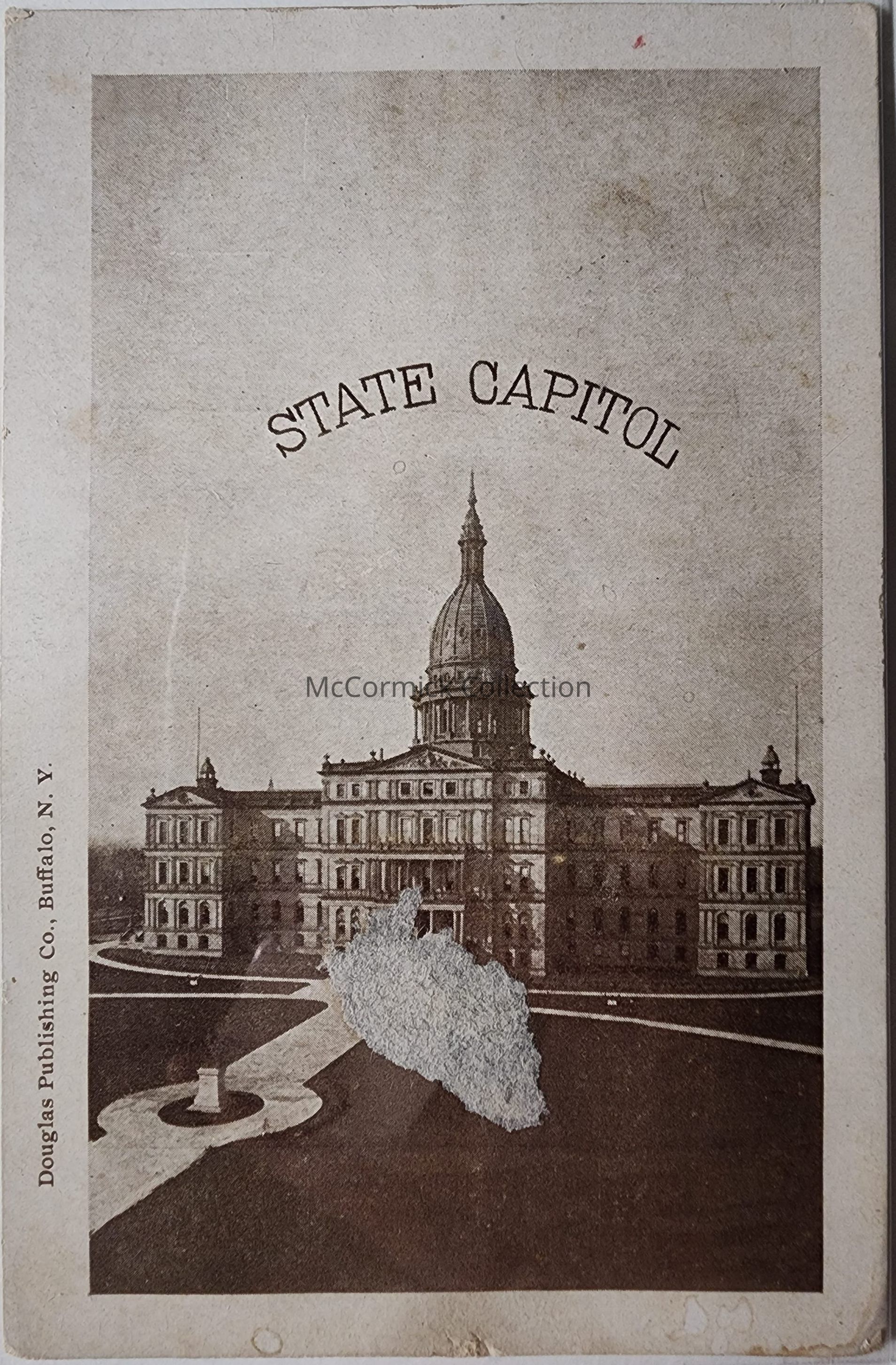 Damaged partial souvenir postcard of Lansing featuring the State Capitol and other Lansing buildings. Circa 1909.