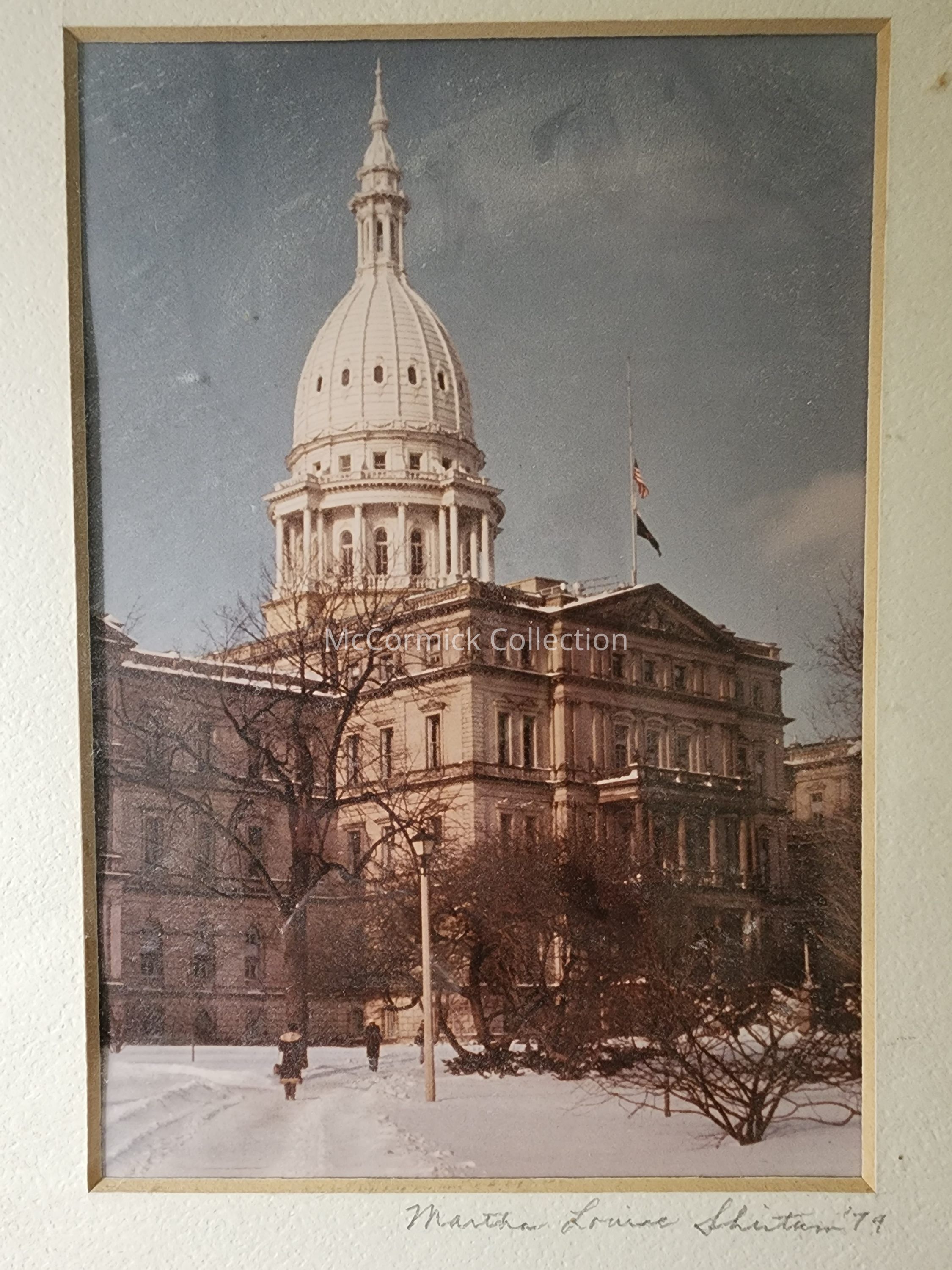 Matted photograph of the Michigan State Capitol, dated 1974, by photographer Martha Louise Shintum (sp) of Lansing. Won honorable mention at the 1974 Detroit Photo Show.