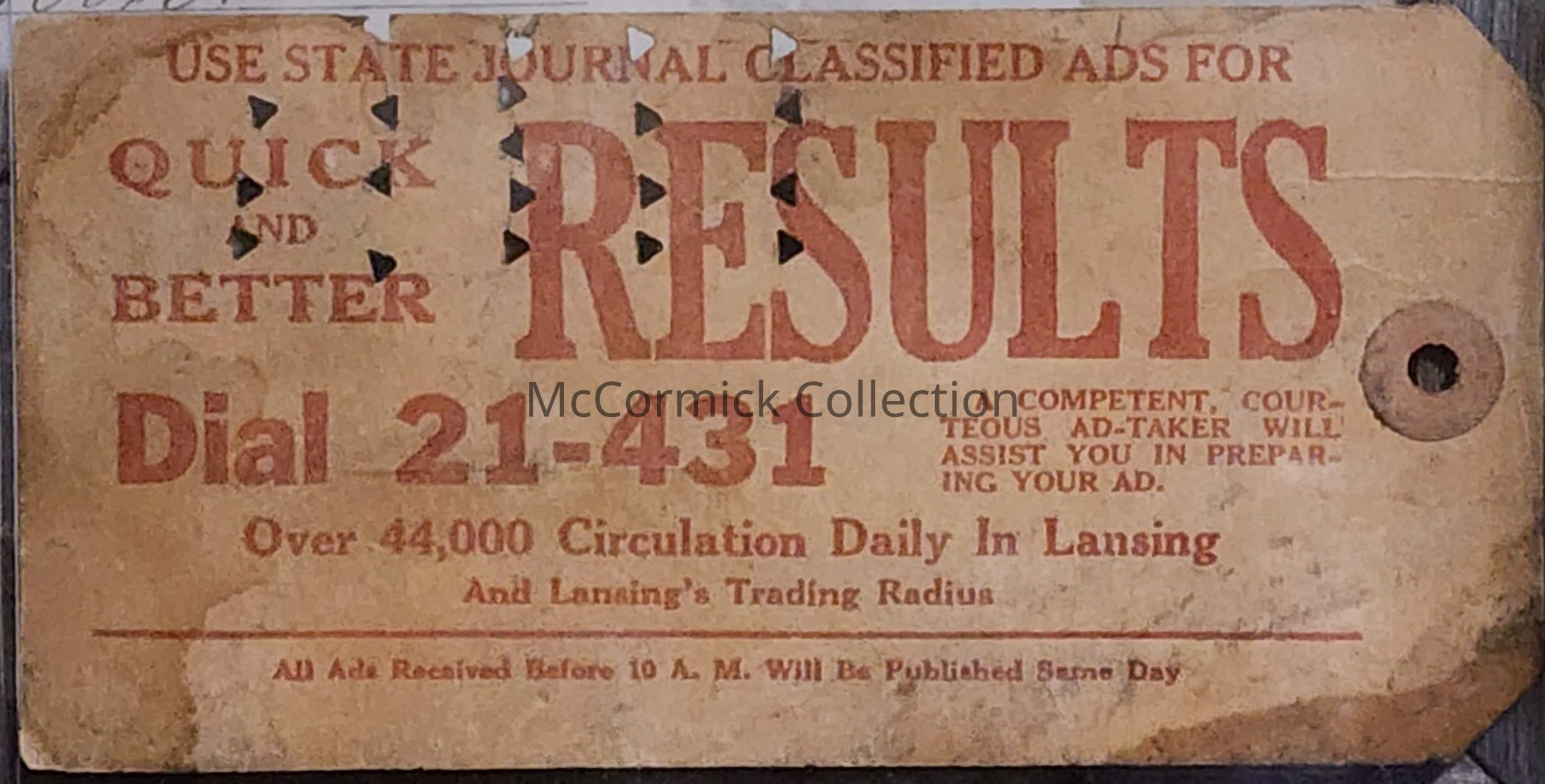 A paper tag with punches from a subscriber to The State Journal newspaper in Lansing, Michigan.