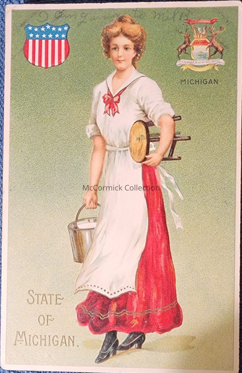 Milk maid postcard representing the State of Michigan. AK 1911 postmark.