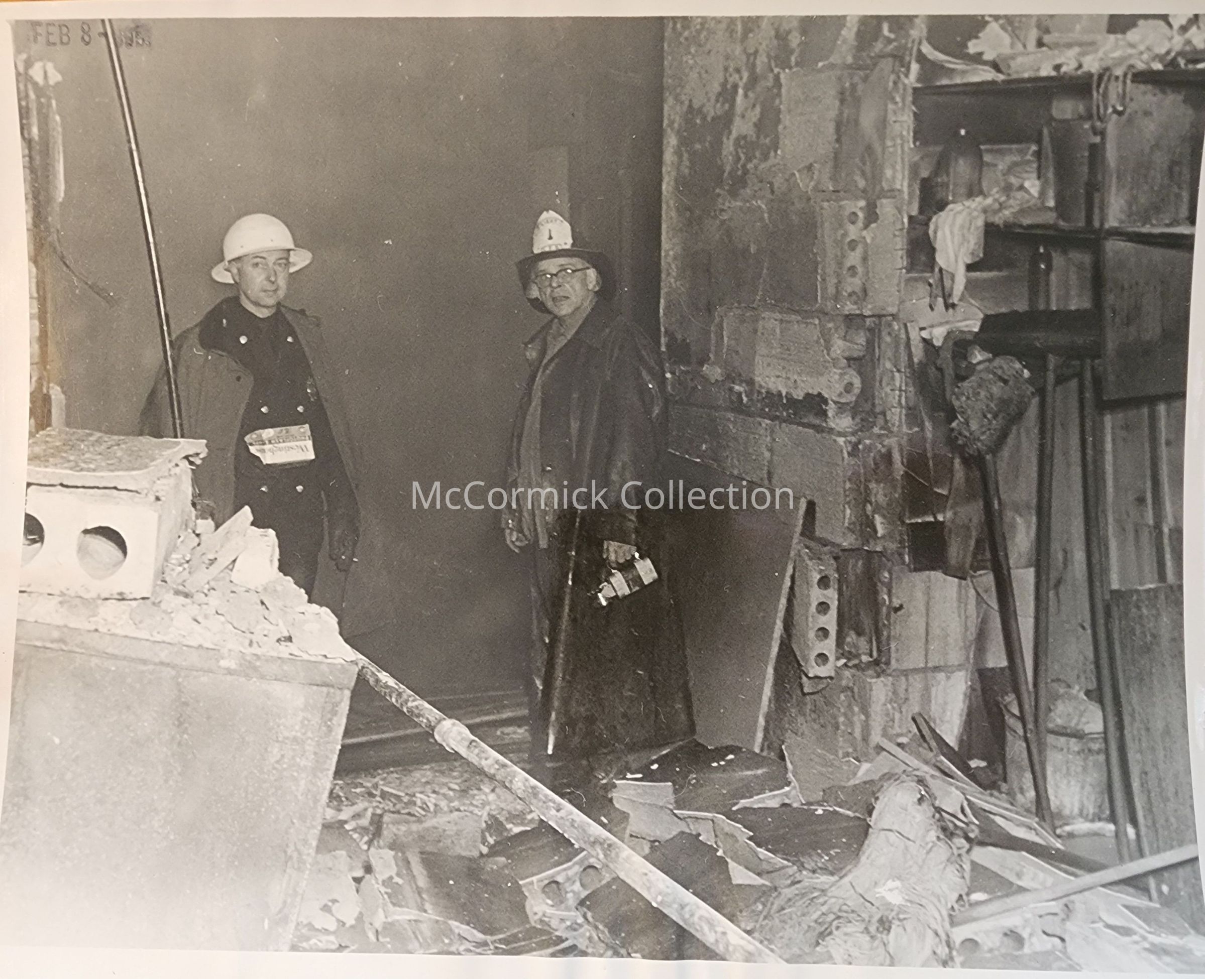 Photographic print of two firefighters in a fire ruins. Dated February 8, 1951. Unidentified location or fire, but very likely the Michigan State Office Building fire.