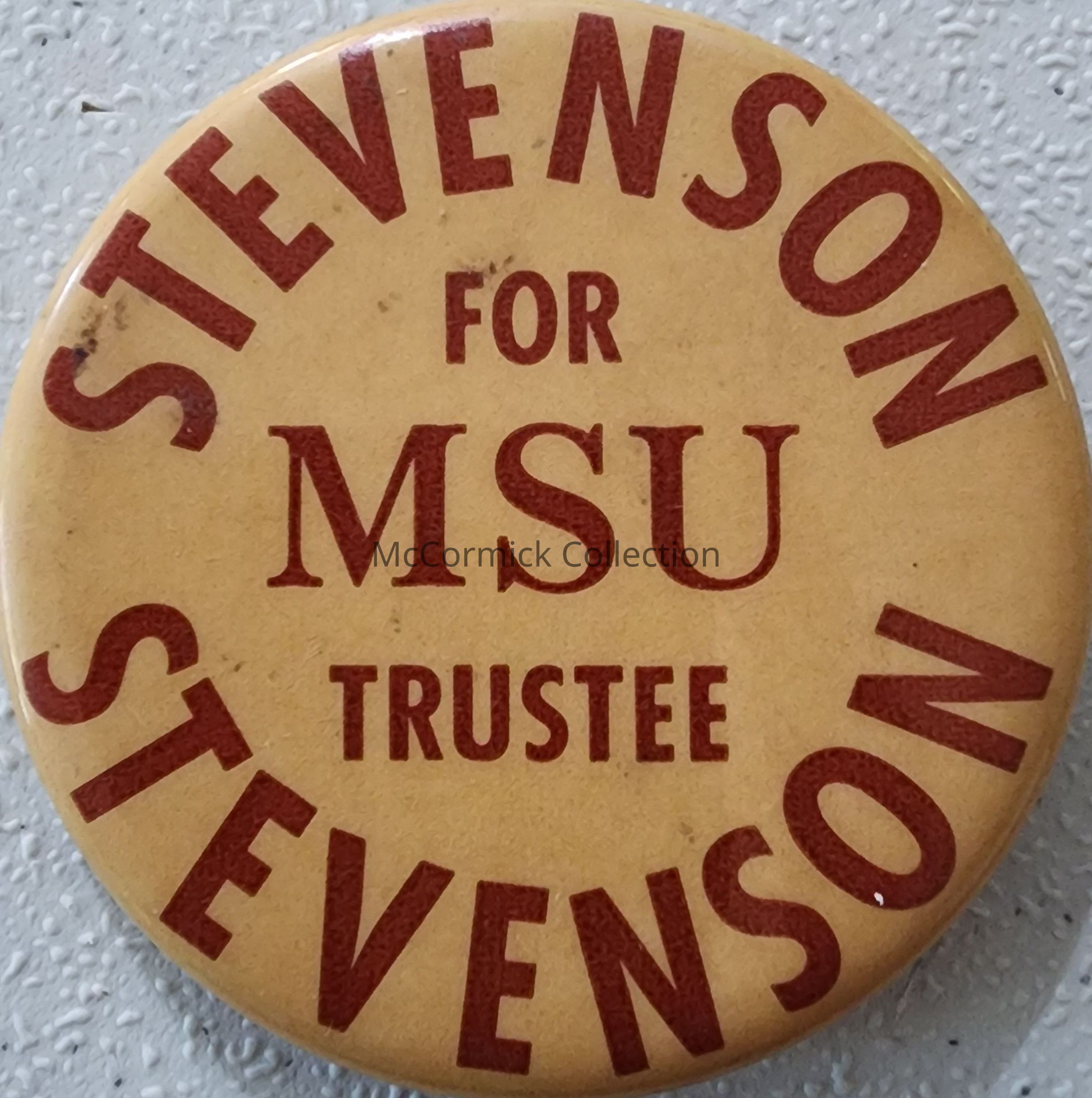 A 2.25" brown tone political button for Stevenson for Michigan State University trustee.