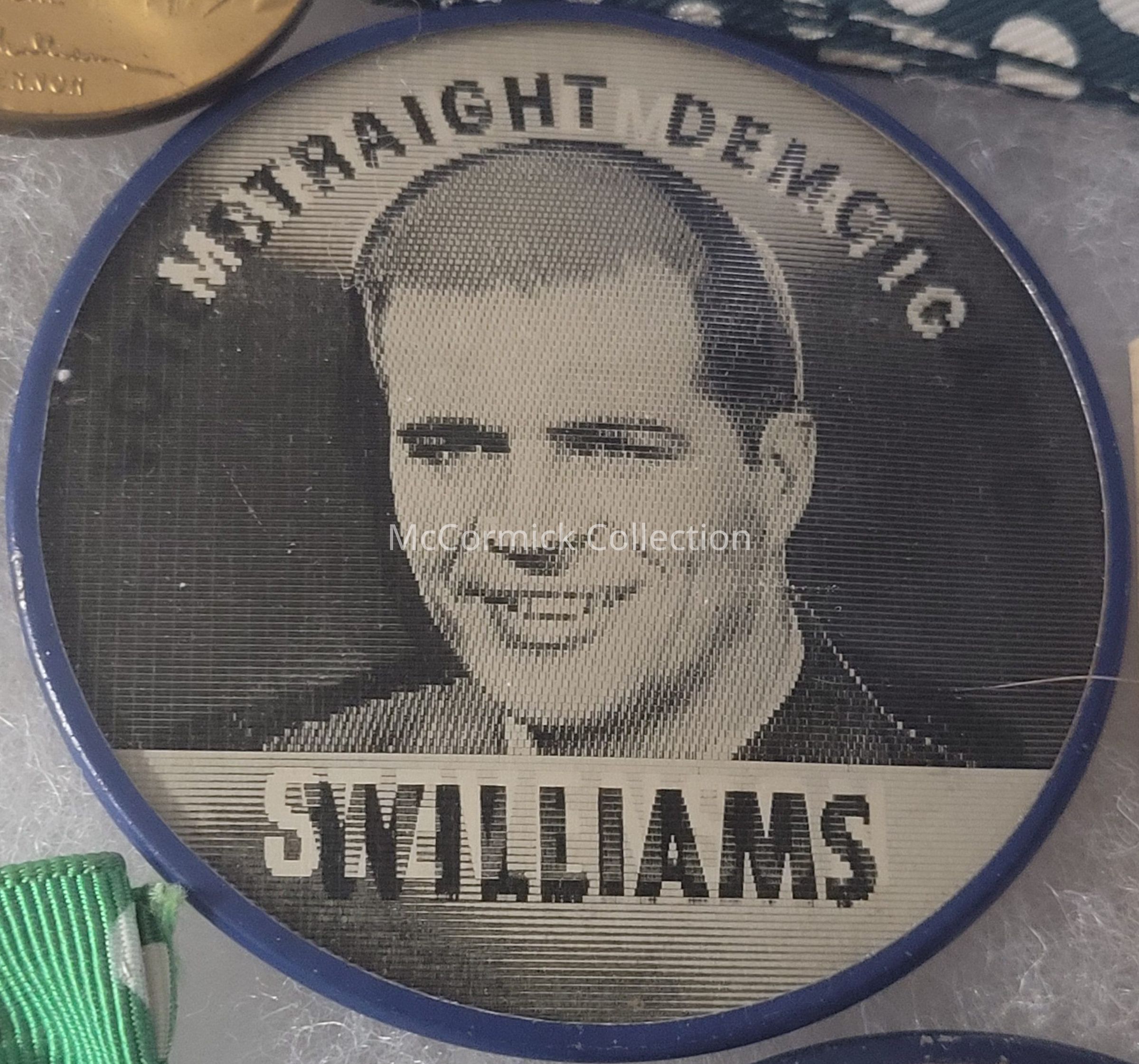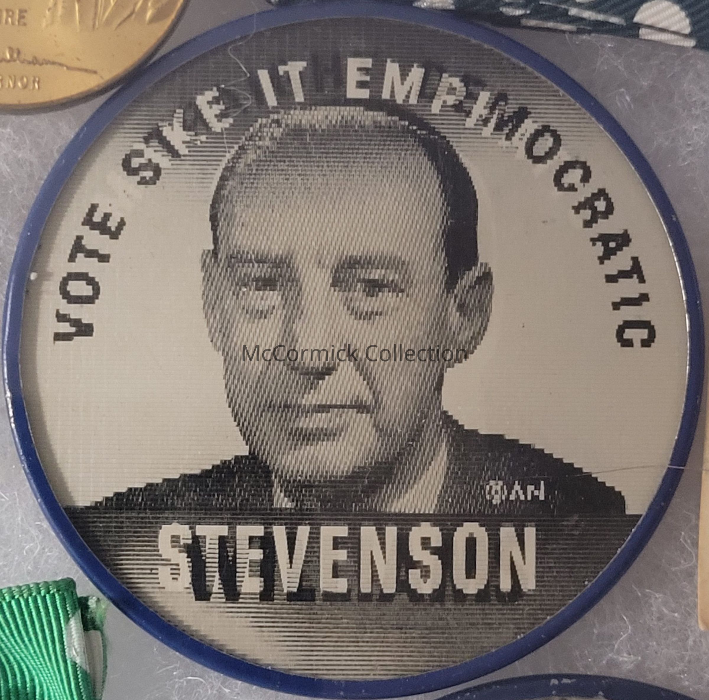 Political flasher button, 2.5", featuring Adlai Stevenson for President and G. Mennen Williams for Governor. It reads: "Make it Emphatic Vote Straight Democratic."