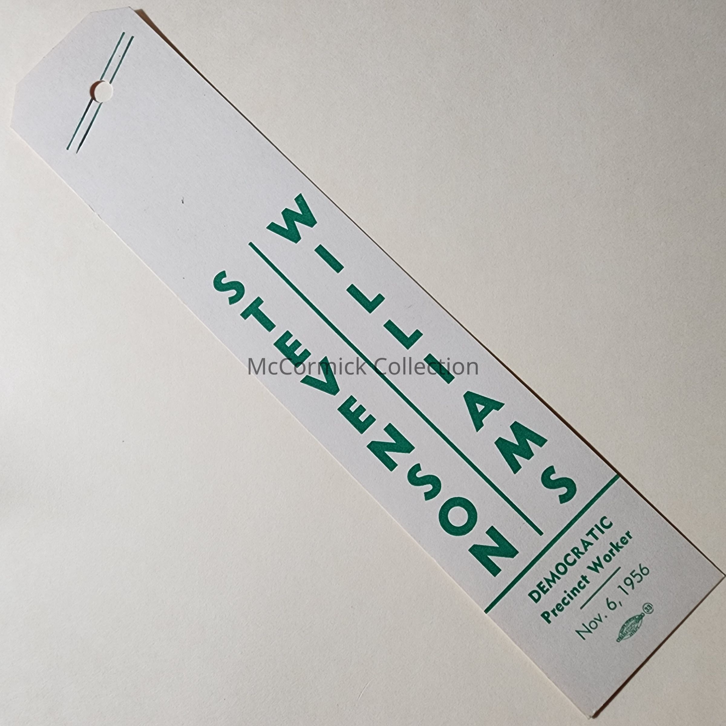 A green and white paper ribbon for Adlai Stevenson for President and G. Mennen Williams for Governor. For a Democratic Precinct Worker, Nov. 6, 1956.