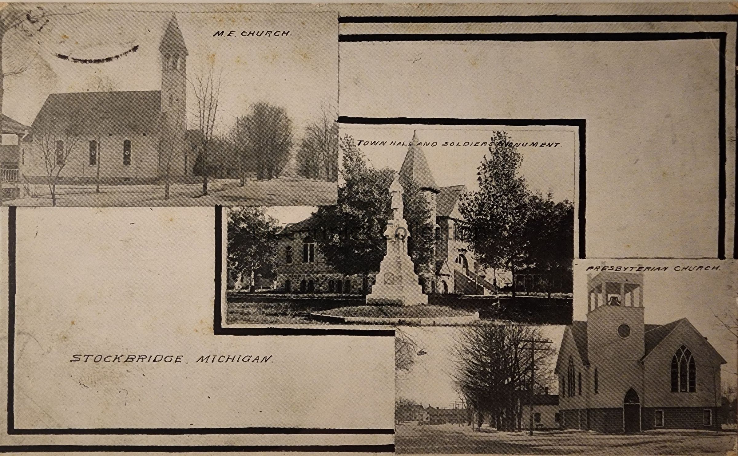 Postally used, Stockbridge postmark 1912. Views of Town Hall and Soldier Monument, M.E. Church, and Presbyterian Church.
