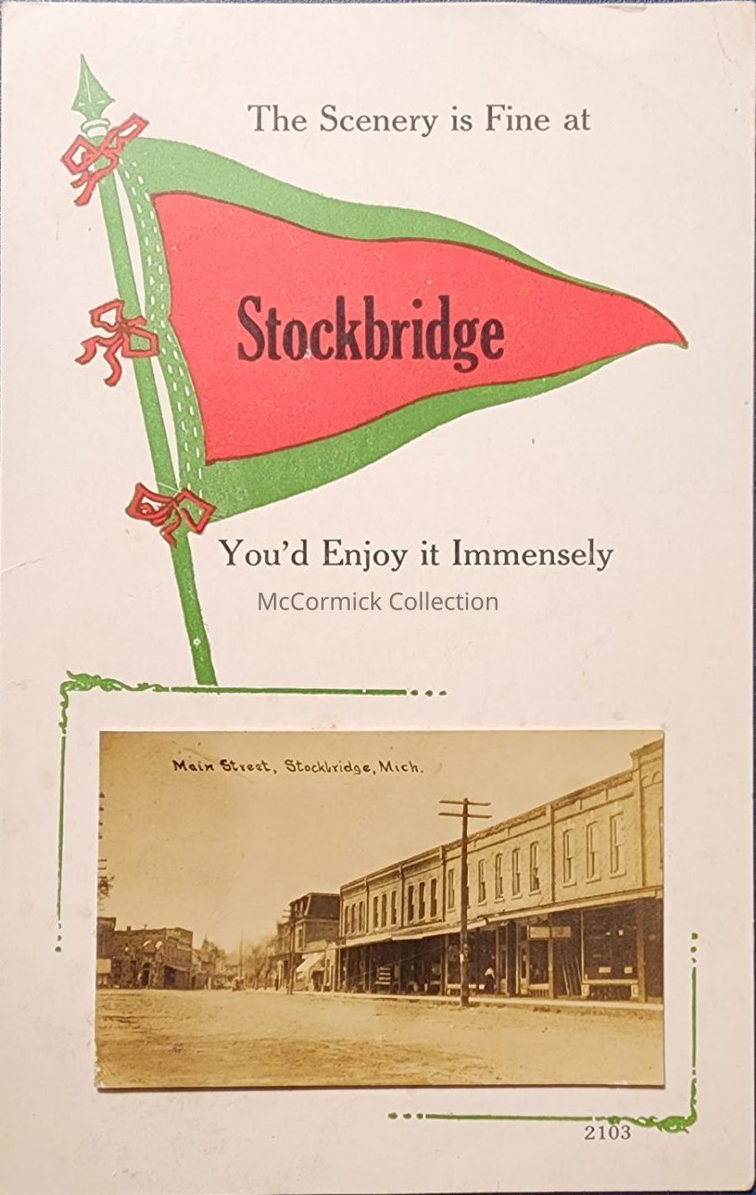 Postcard from Stockbridge, Michigan, with Pennant and affixed real photo of town.