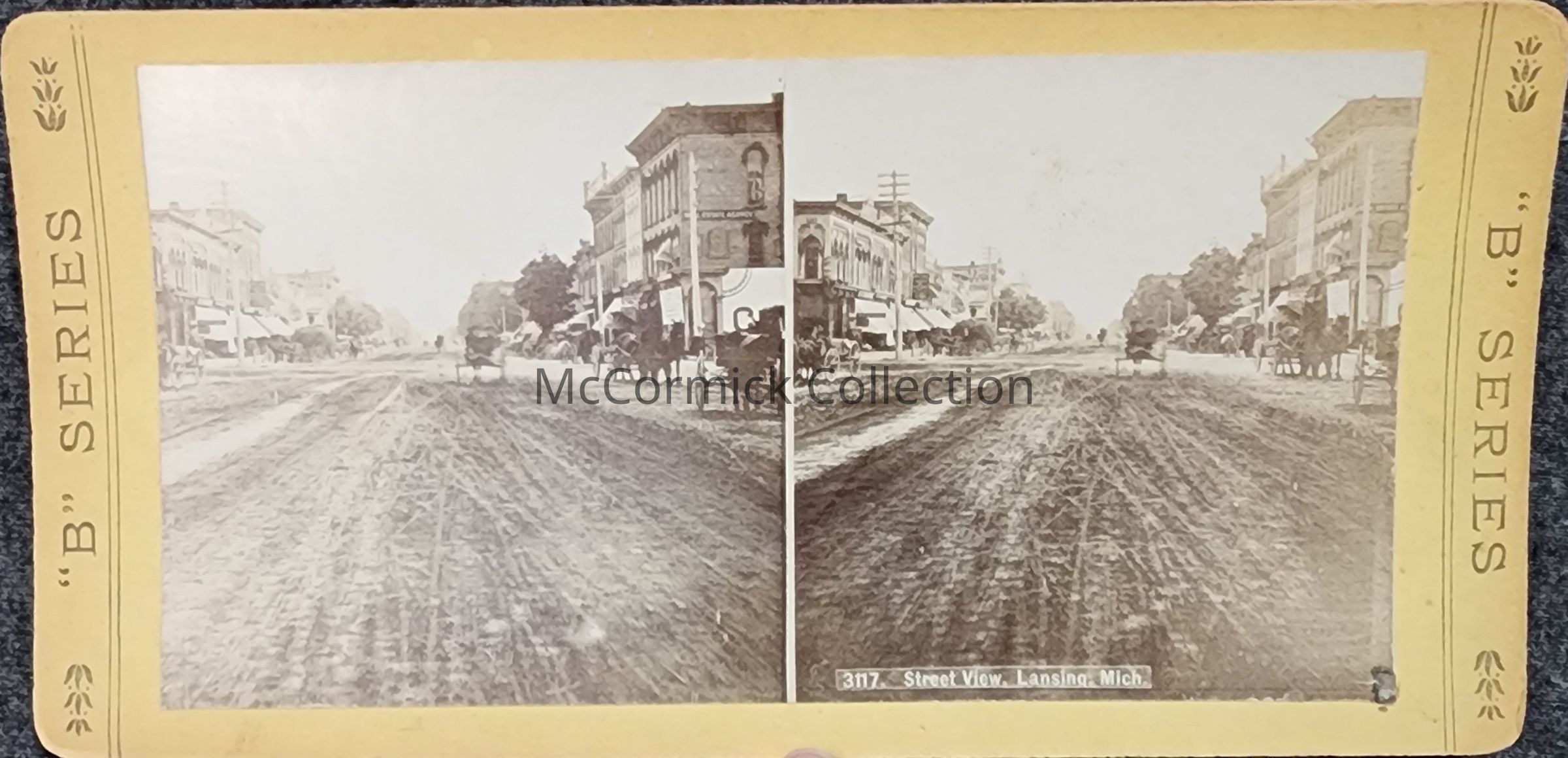 Stereograph of a street view of Washington Avenue in Lansing, Michigan, mounted on a yellow card with "B" Series attribution and 3117 code. No photographer.