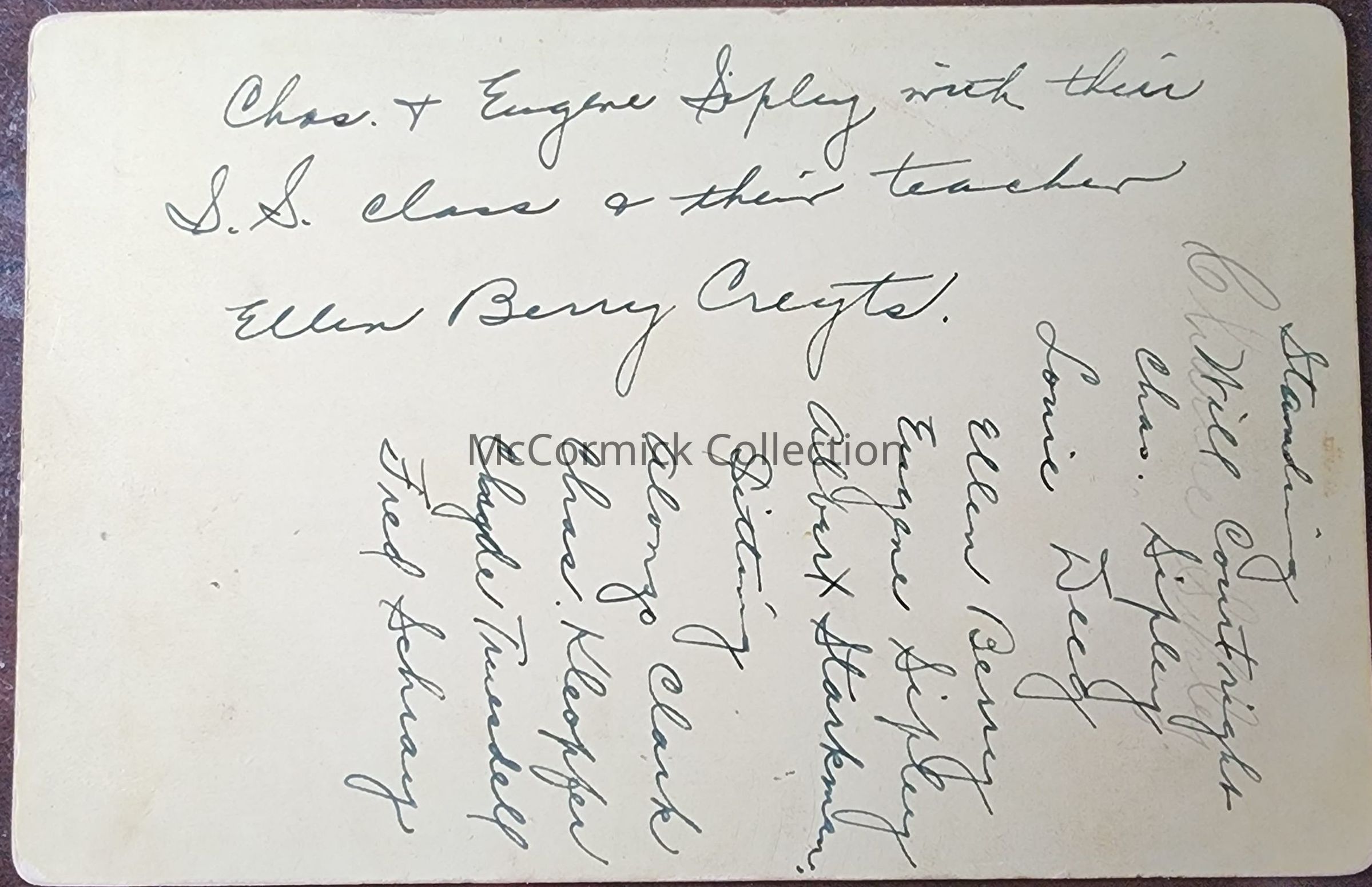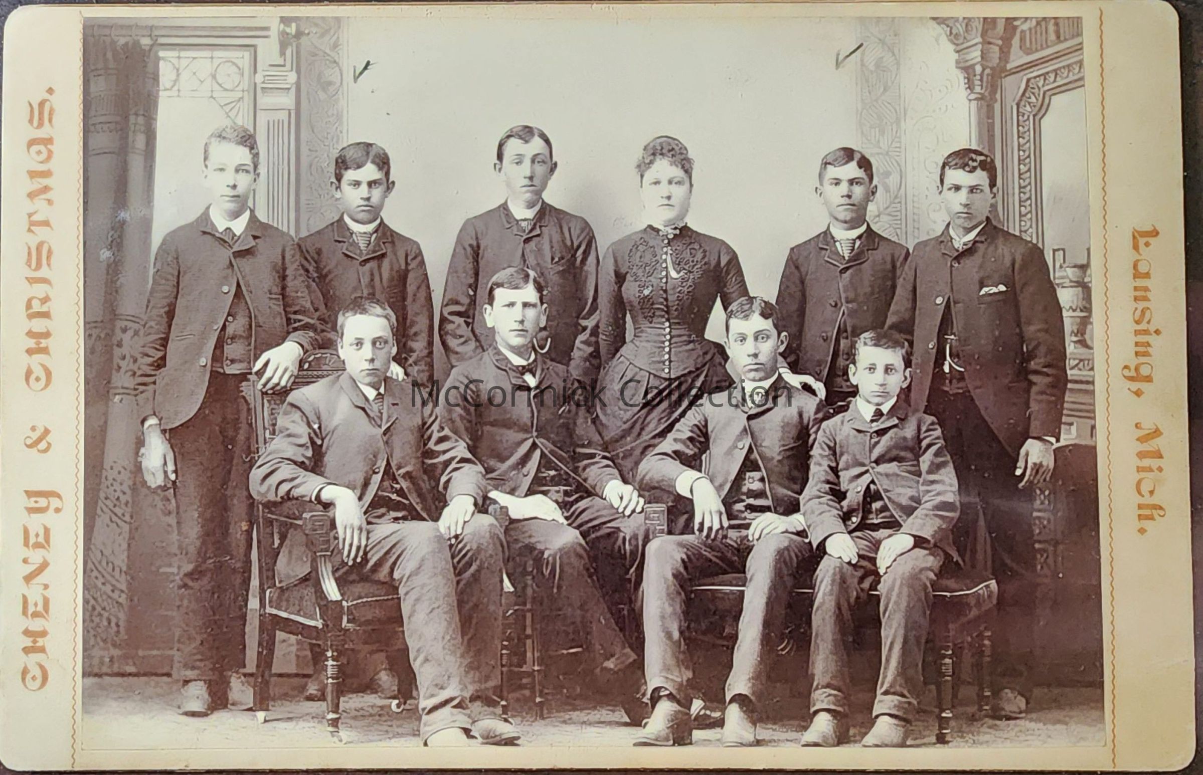 Cabinet card photograph of a group by Lansing photographer Cheney and Christmas. They are identified as Chas. and Eugene Sipley with their S.S. class and their teacher Ellen Berry Creyts. Names listed are, standing: Will Courtright, Chas. Sipley, Lonie Deeg, Ellen Berry, Eugene Sipley, Albert Starkman; sitting: Alonzo Clark, Chas. Kloepfer, Clyde Truesdell, and Fred Schray.Made/Created
