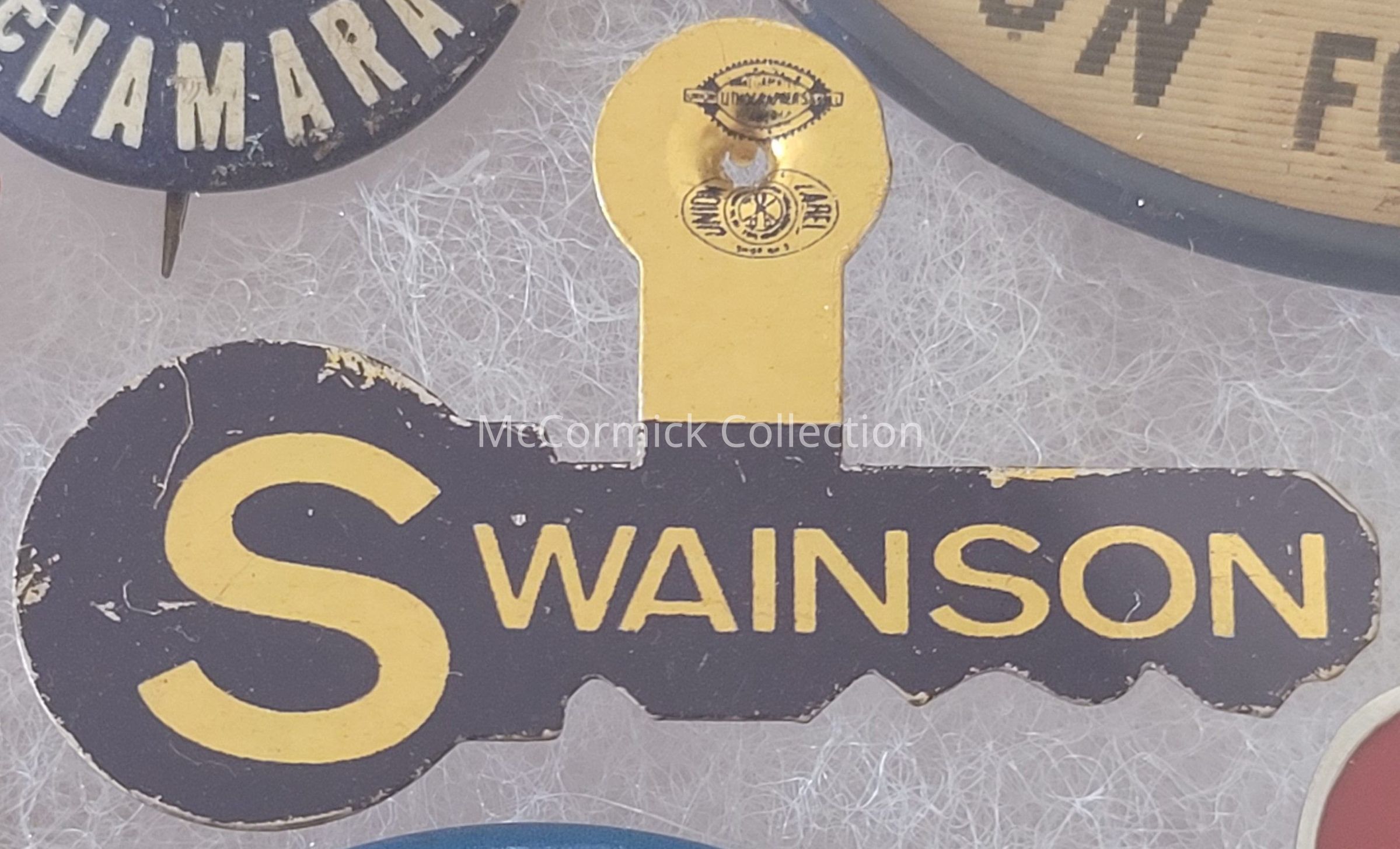 A 1.75" blue and gold metal key shaped tab for John Swainson for Governor.