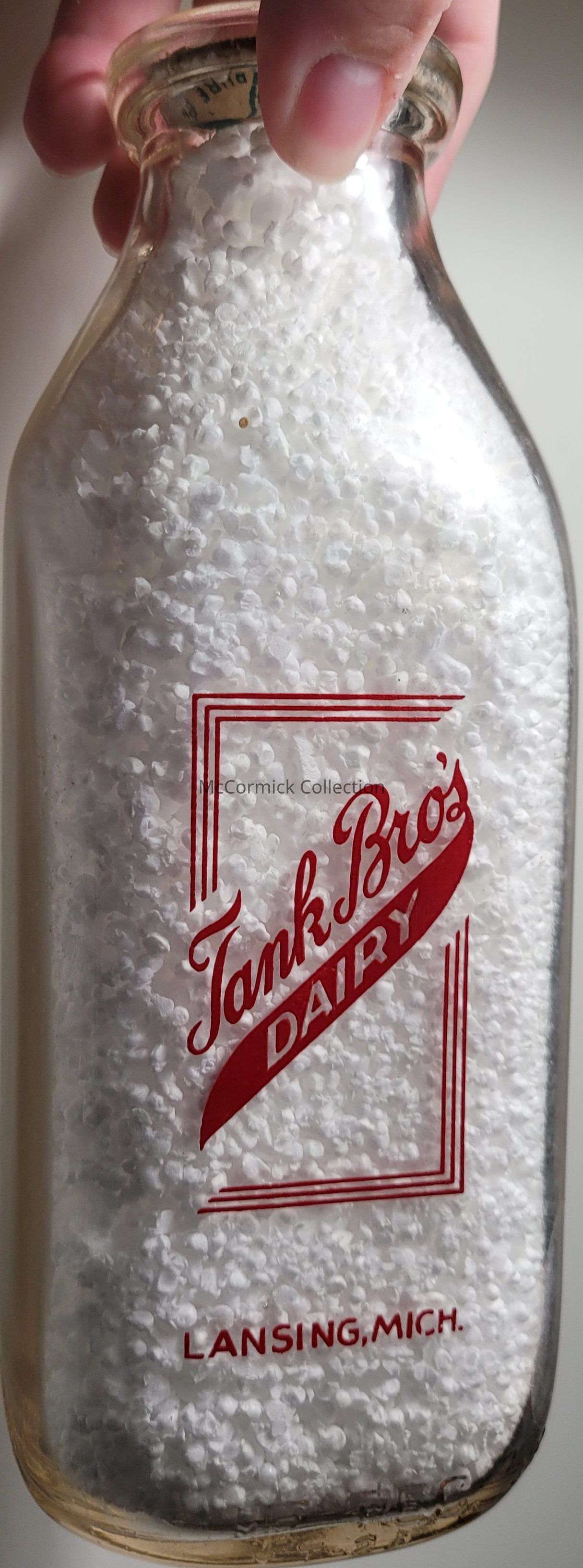 A red pyro square quart bottle from the Tank Bros Dairy of Lansing, Michigan. Locate on Willow Street.