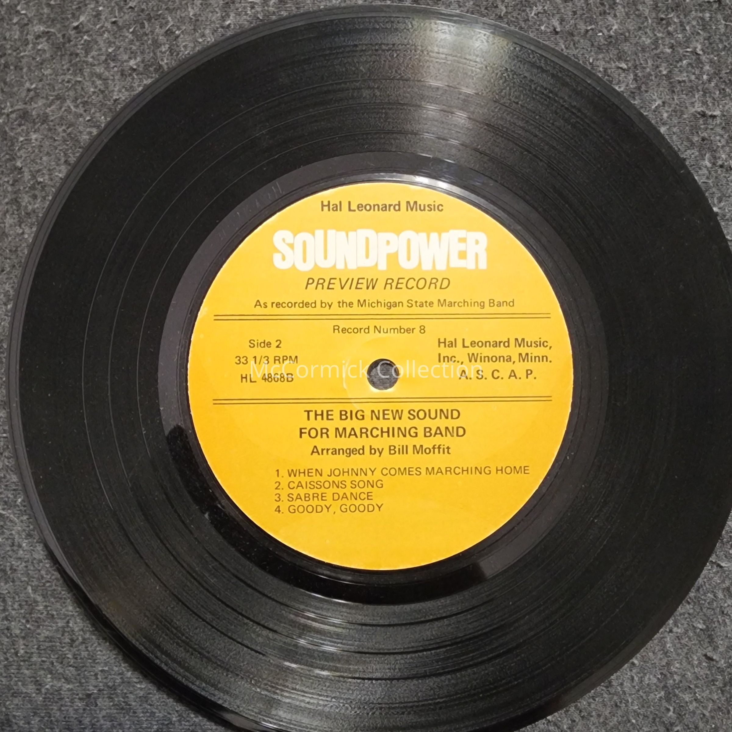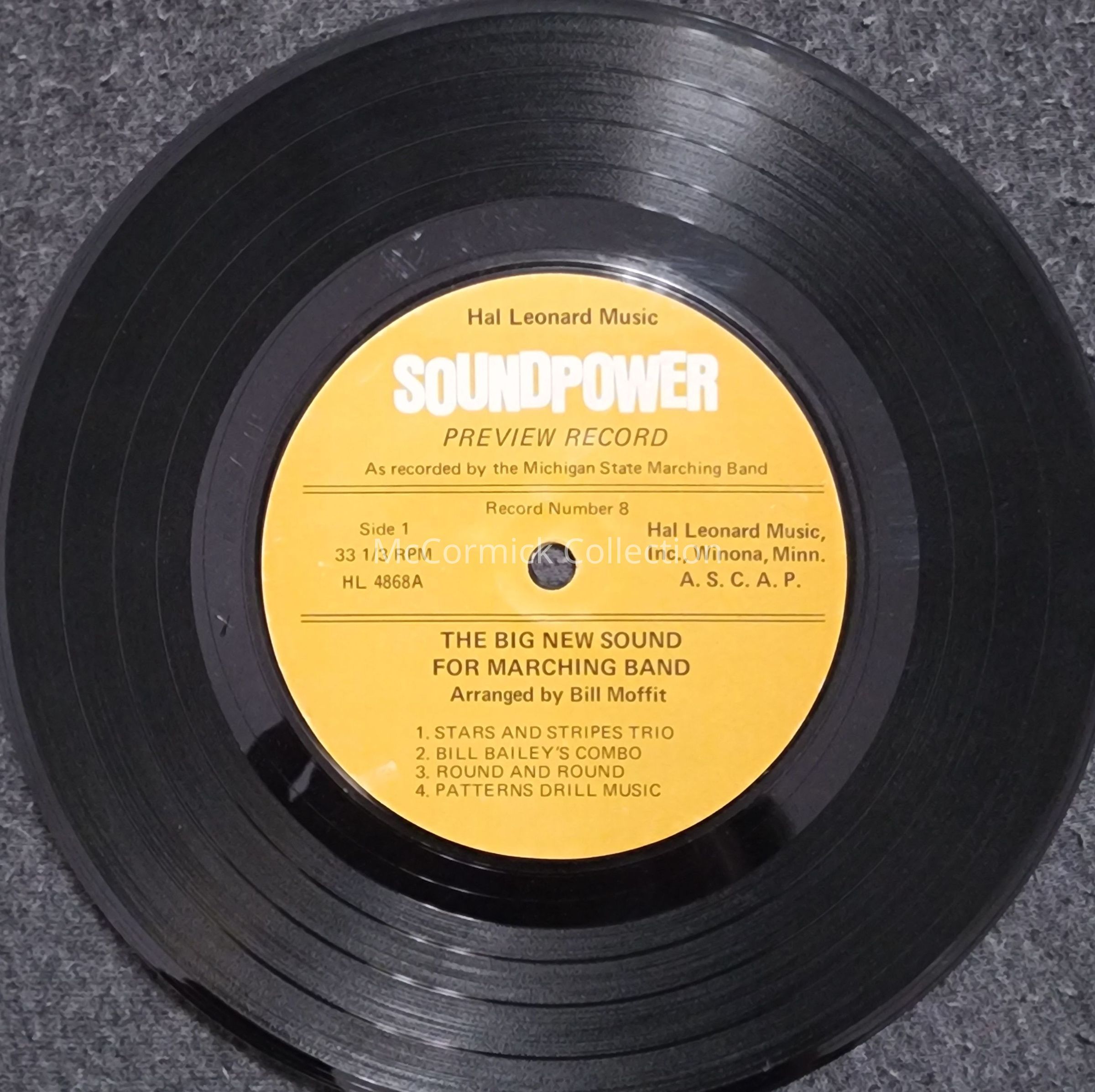 Arrangements by Bill Moffit, recorded by the Michigan State University Spartan Marching Band. Circa 1960s.