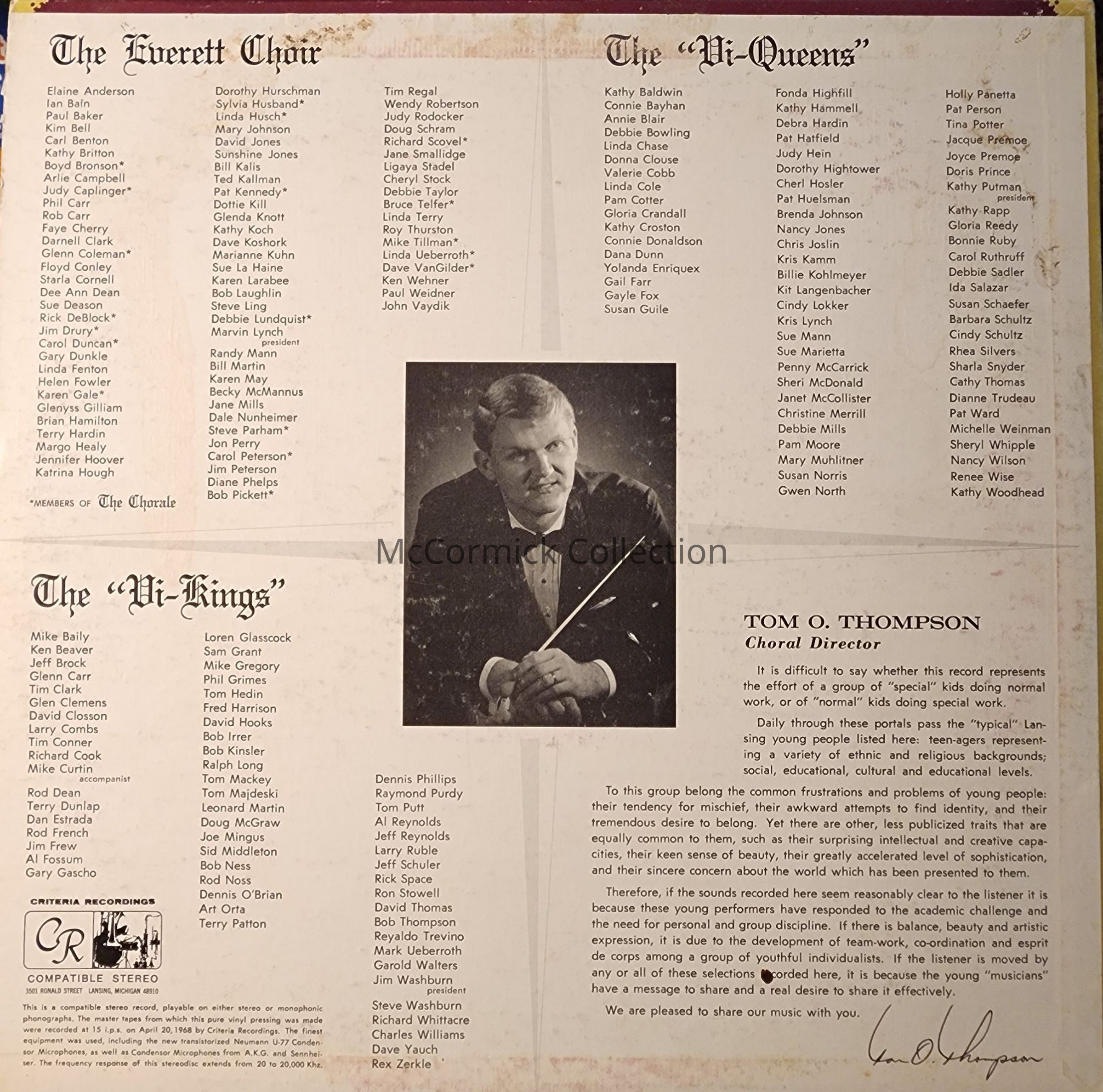 Lansing Everett High School Vocal Music Department, 1968. Criteria Recordings, Lansing, Michigan.