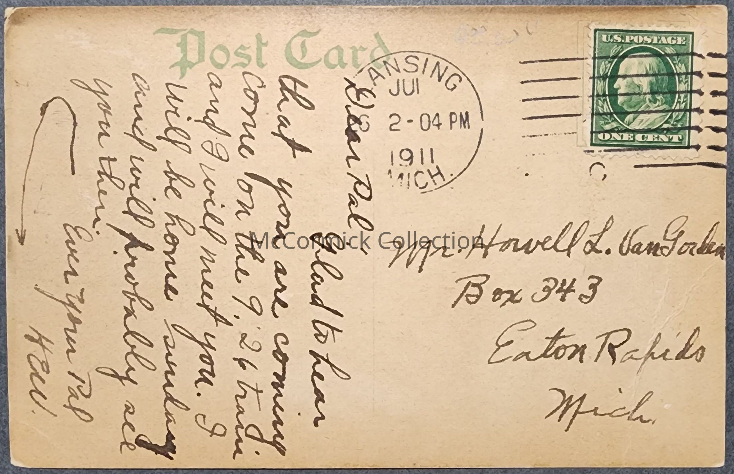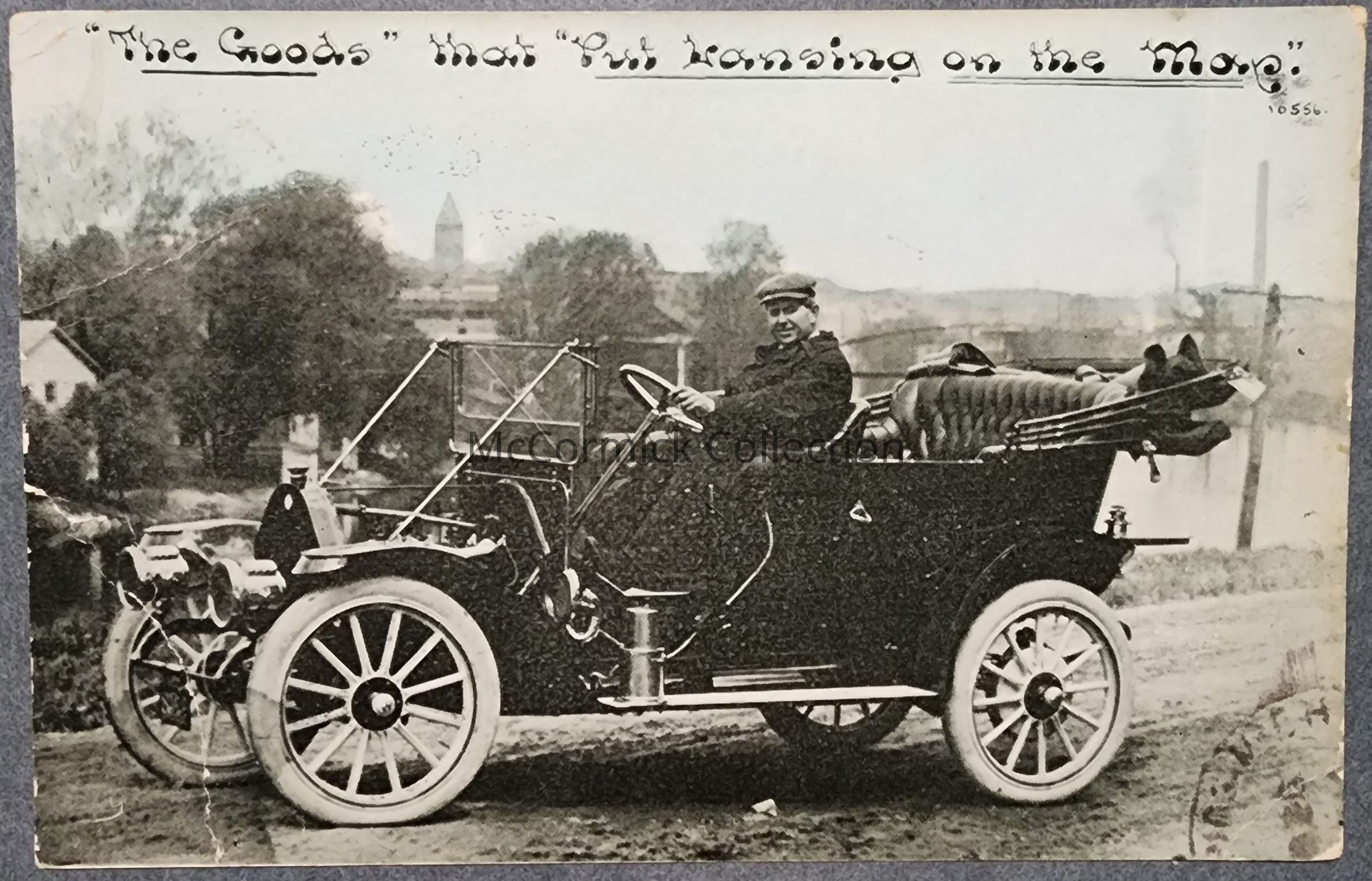 Postcard of a Man in an automobile, car, with Lansing City Hall tower in the distance. Caption is "'The Goods' that 'Put Lansing on the Map'." Numbered 10556. Postally used, 1911 Lansing postmark.