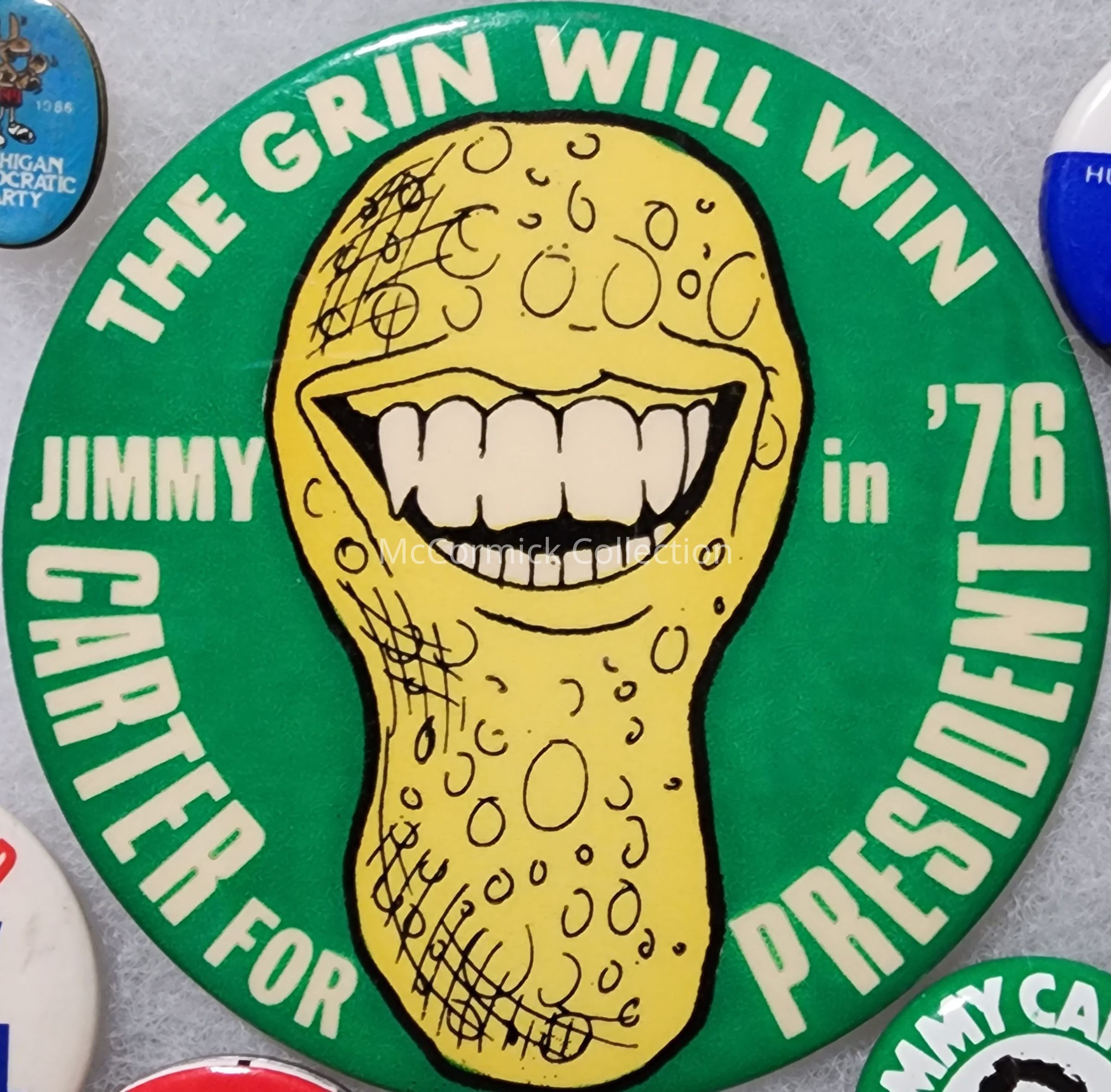 A 3.5" political button for Jimmy Carter for President in 1976, using "The Grin will Win" slogan. The smiling peanut logo is also used.