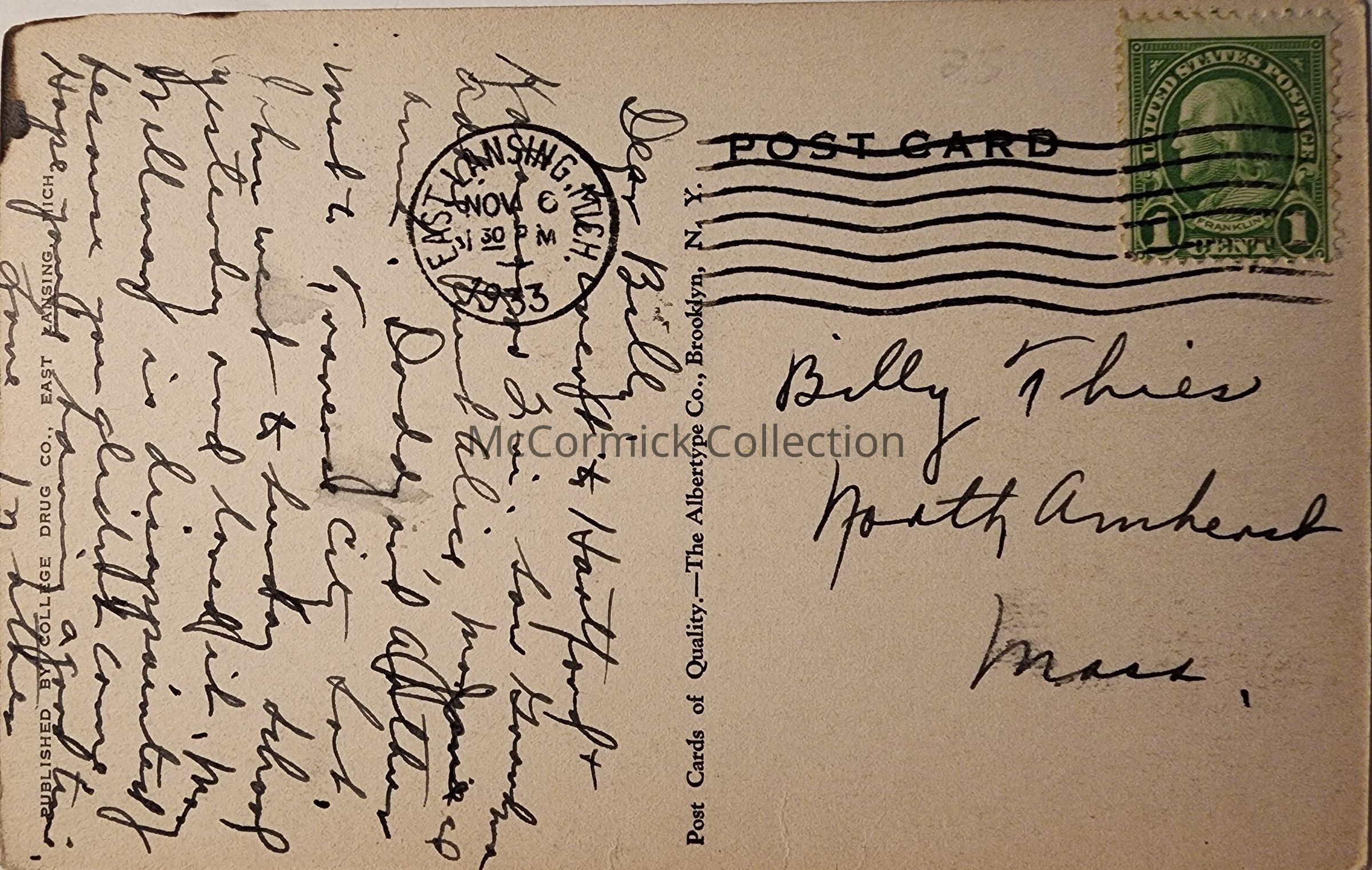 Postally used, East Lansing 1933 postmark.