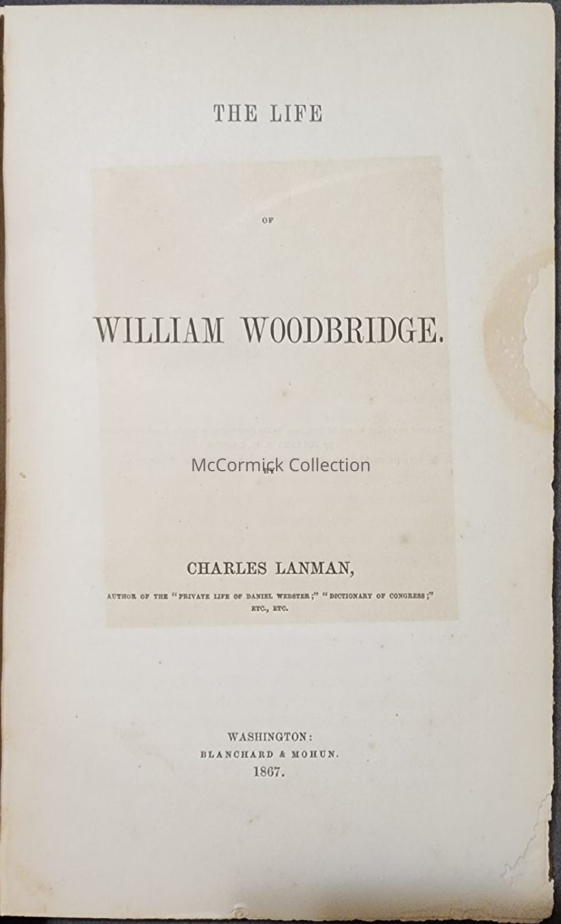 The 1867 biography titled "The Life of William Woodbridge," governor and senator from Michigan. Includes a pasted in original photographic print of Woodbridge facing the title page.