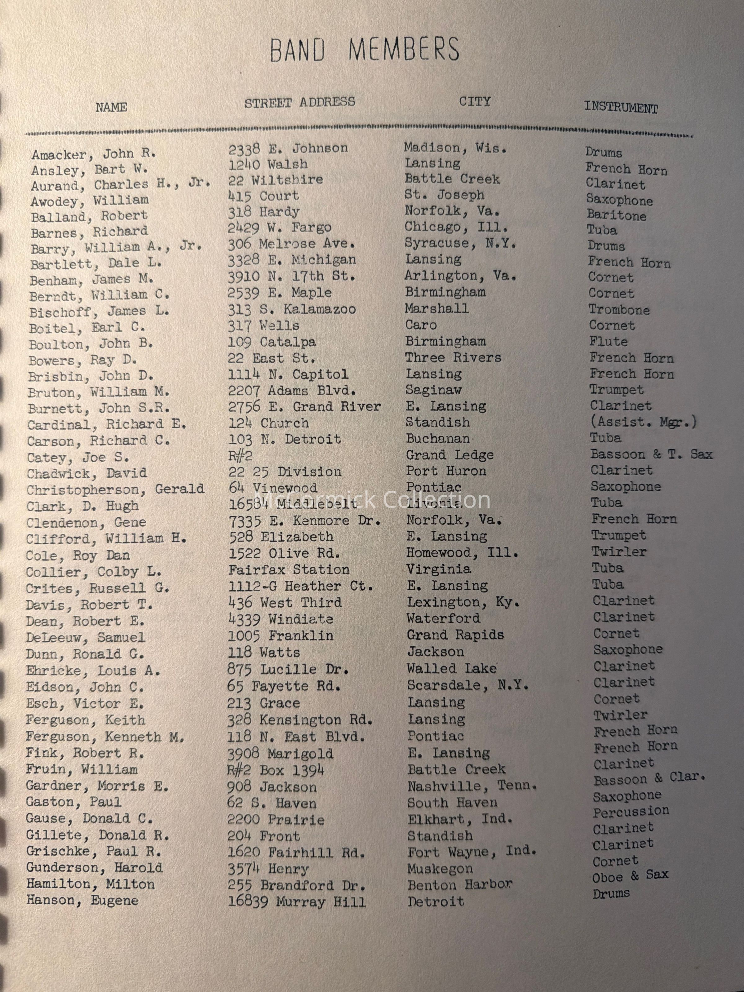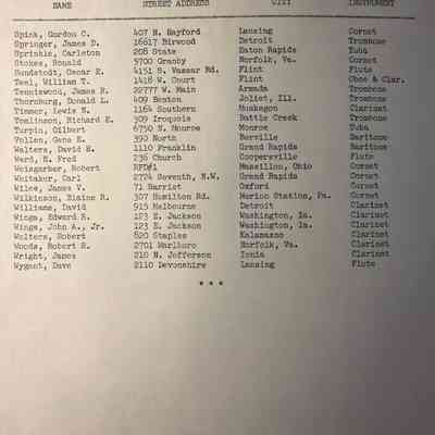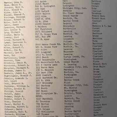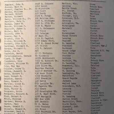 Comb bound 1954 booklet. Lists formations and band members. From the Charles Ross collection.