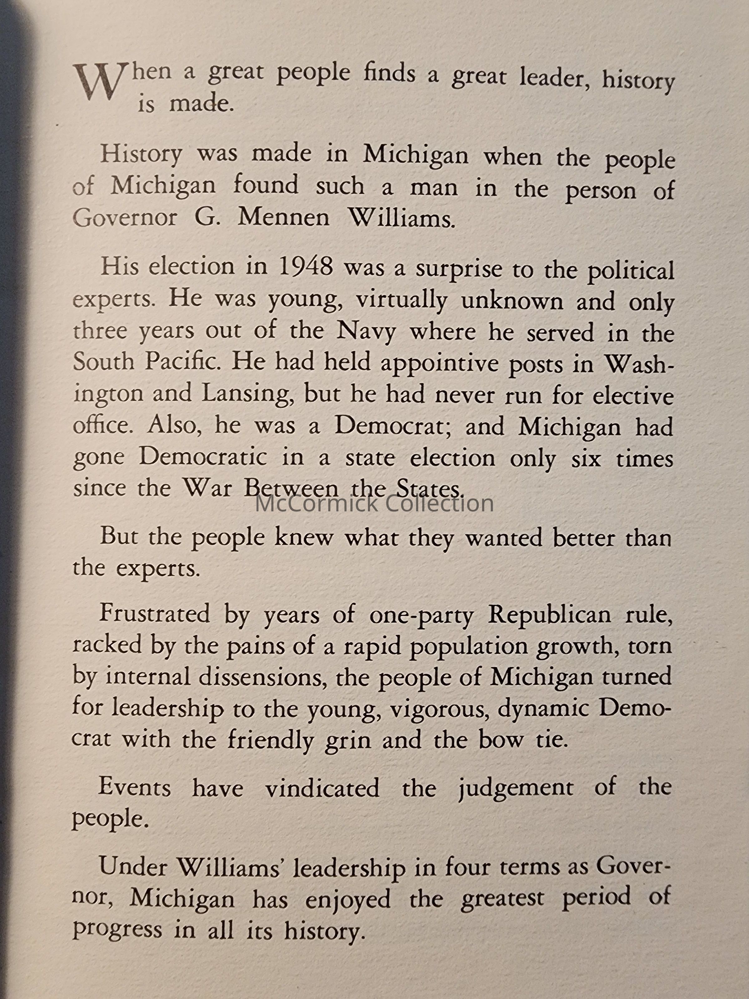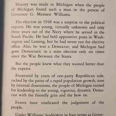 A short history of G. Mennen Williams political accomplishments as Governor.
