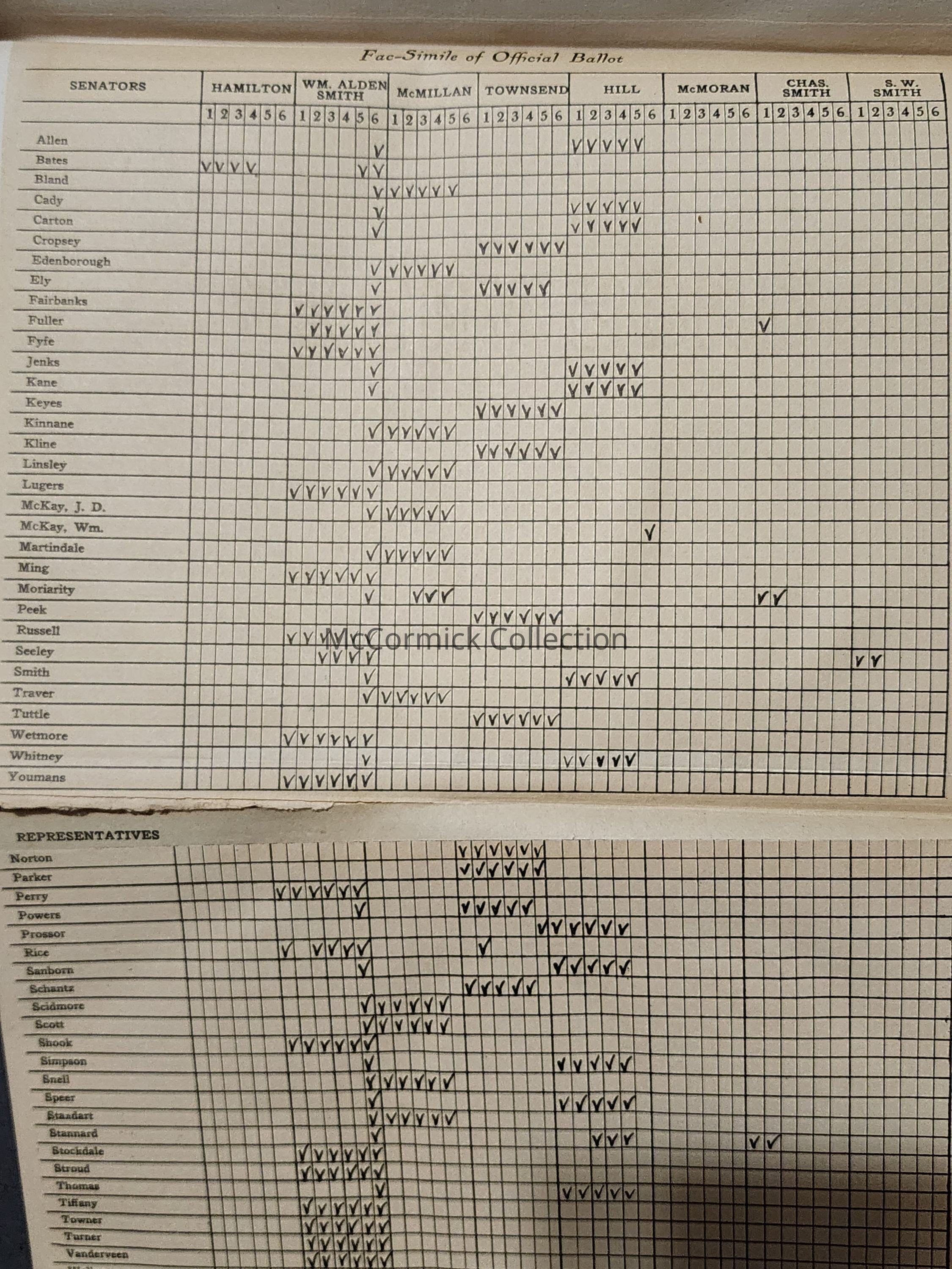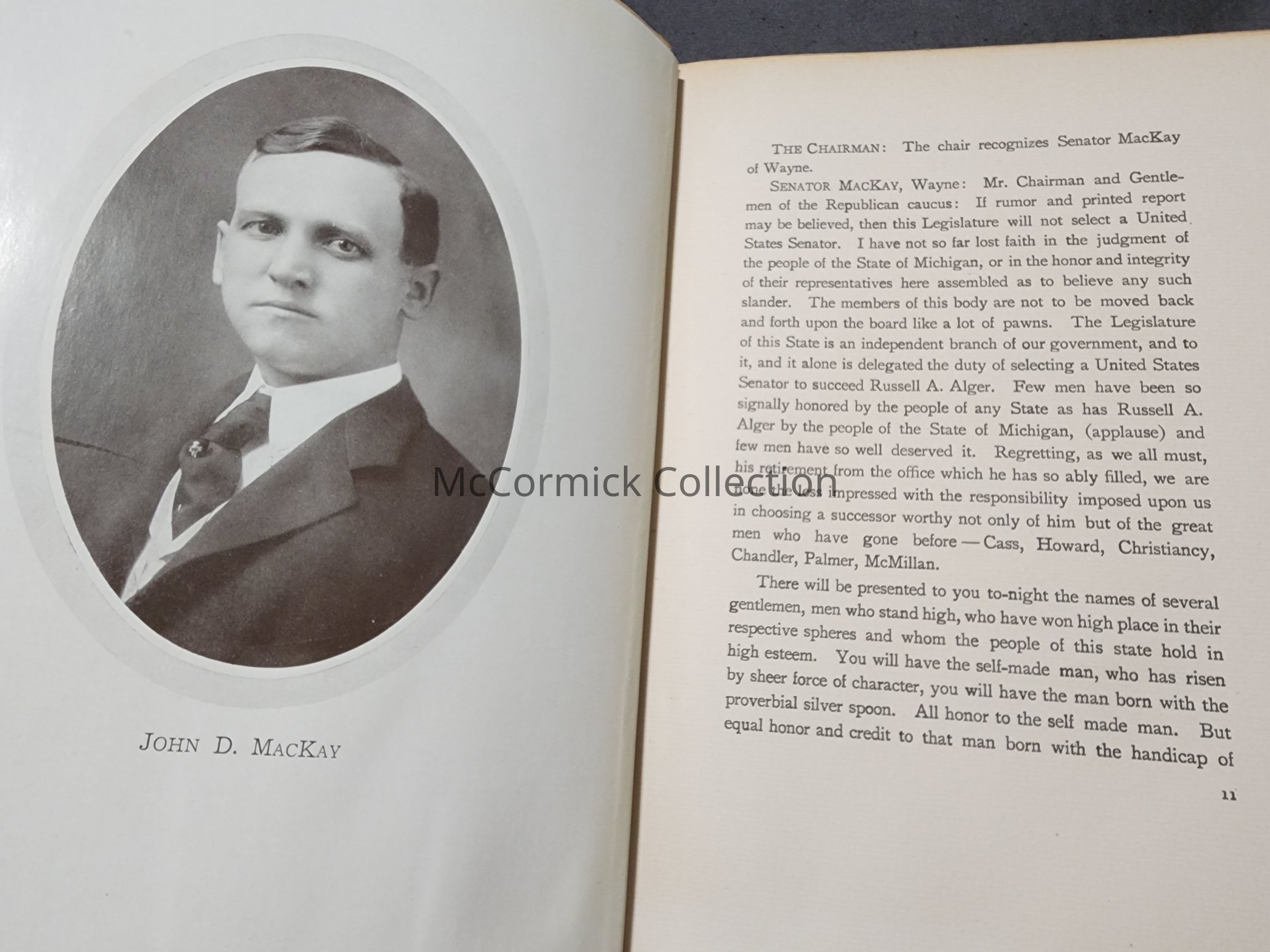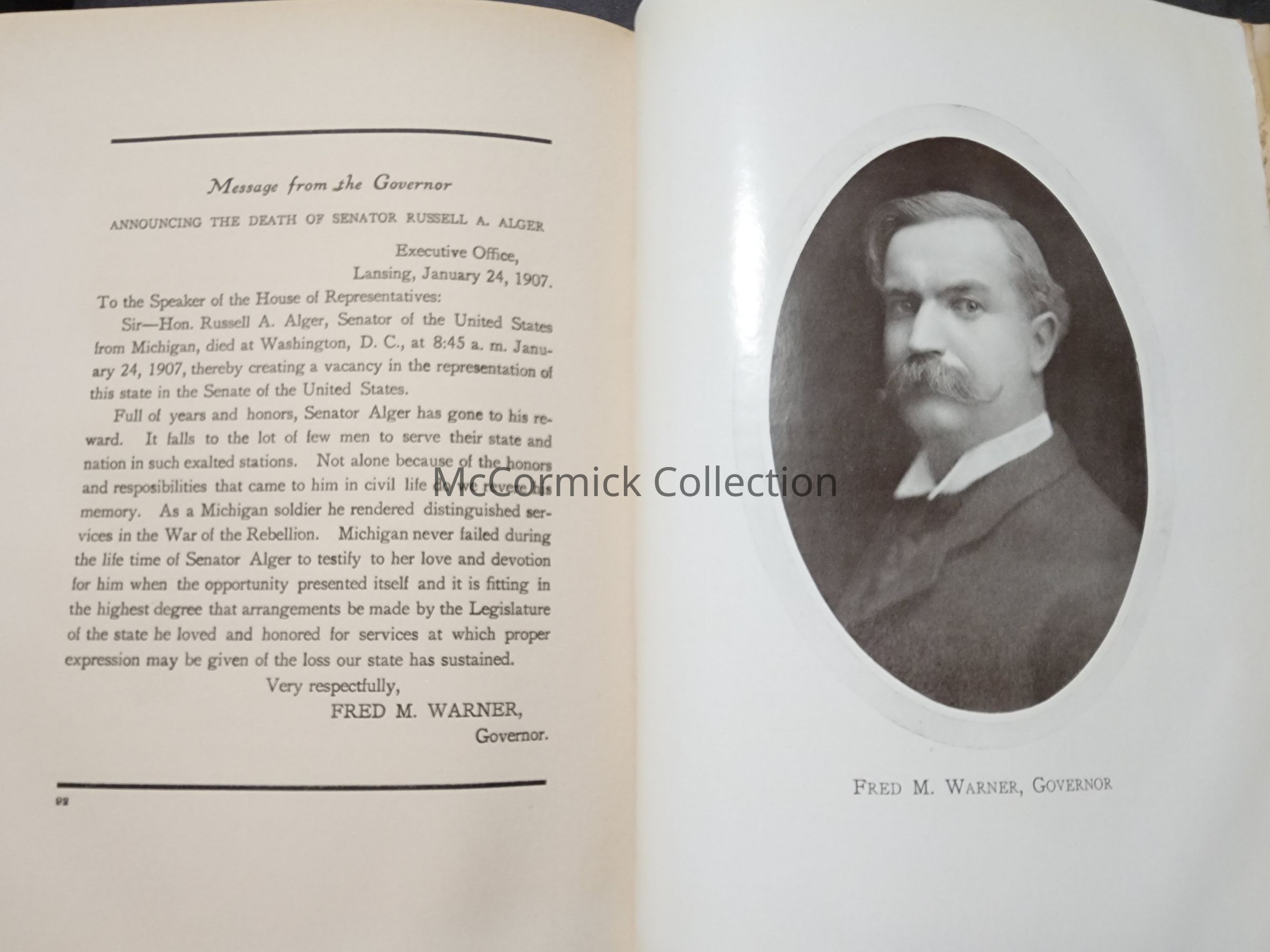 The published proceedings of the 1907 session to nominate a United States Senator from Michigan by the state legislature in Lansing. The State and U.S. Capitols are pictured on the cover.