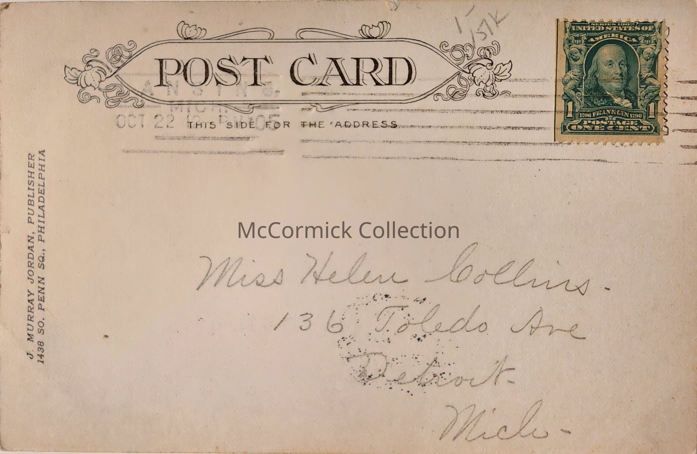 Postally used, Lansing 1905 postmark.