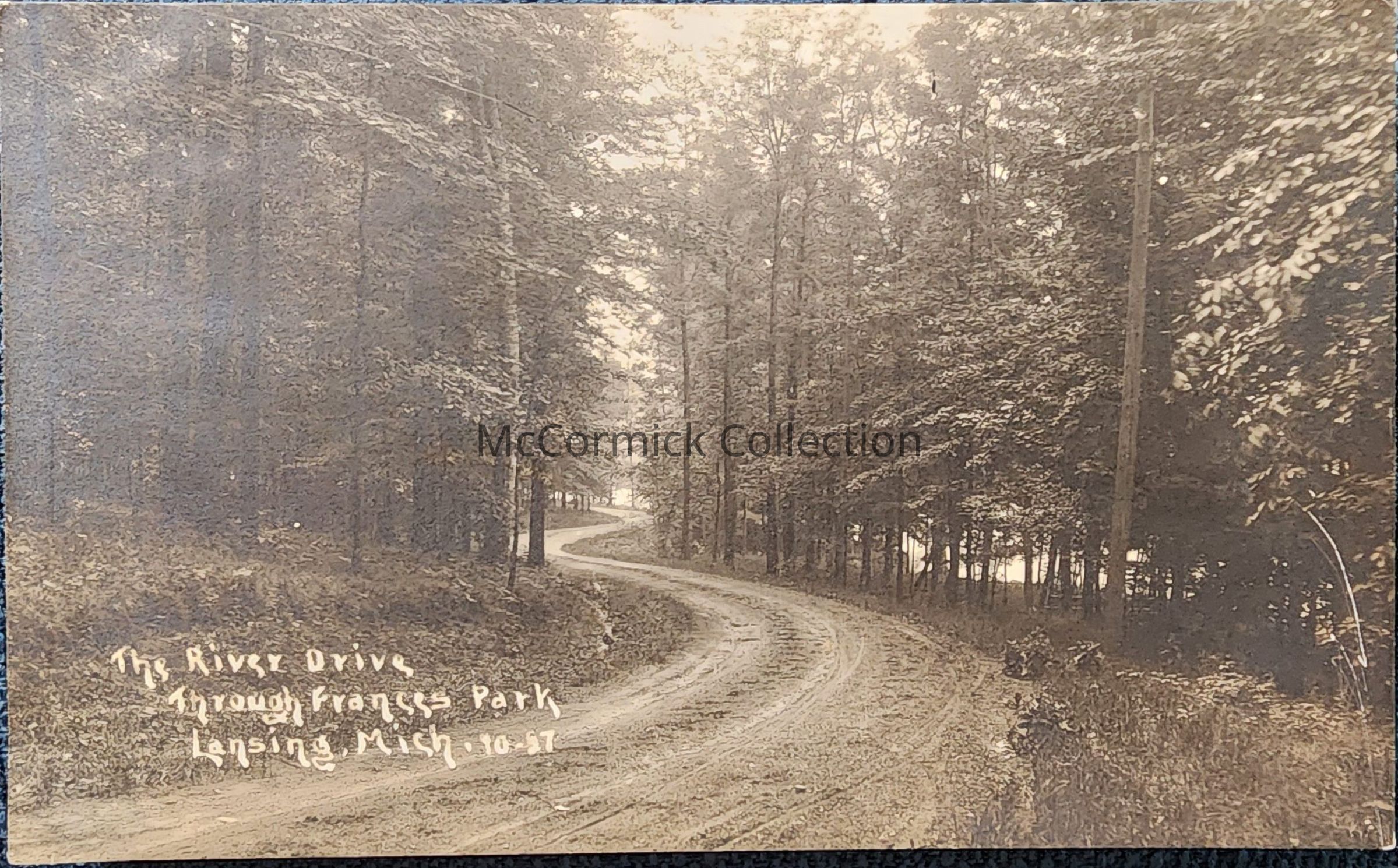 Real photo postcard of the river drive through Francis Park in Lansing, Michigan. Negative number is 10-57. Postmarked 1913.