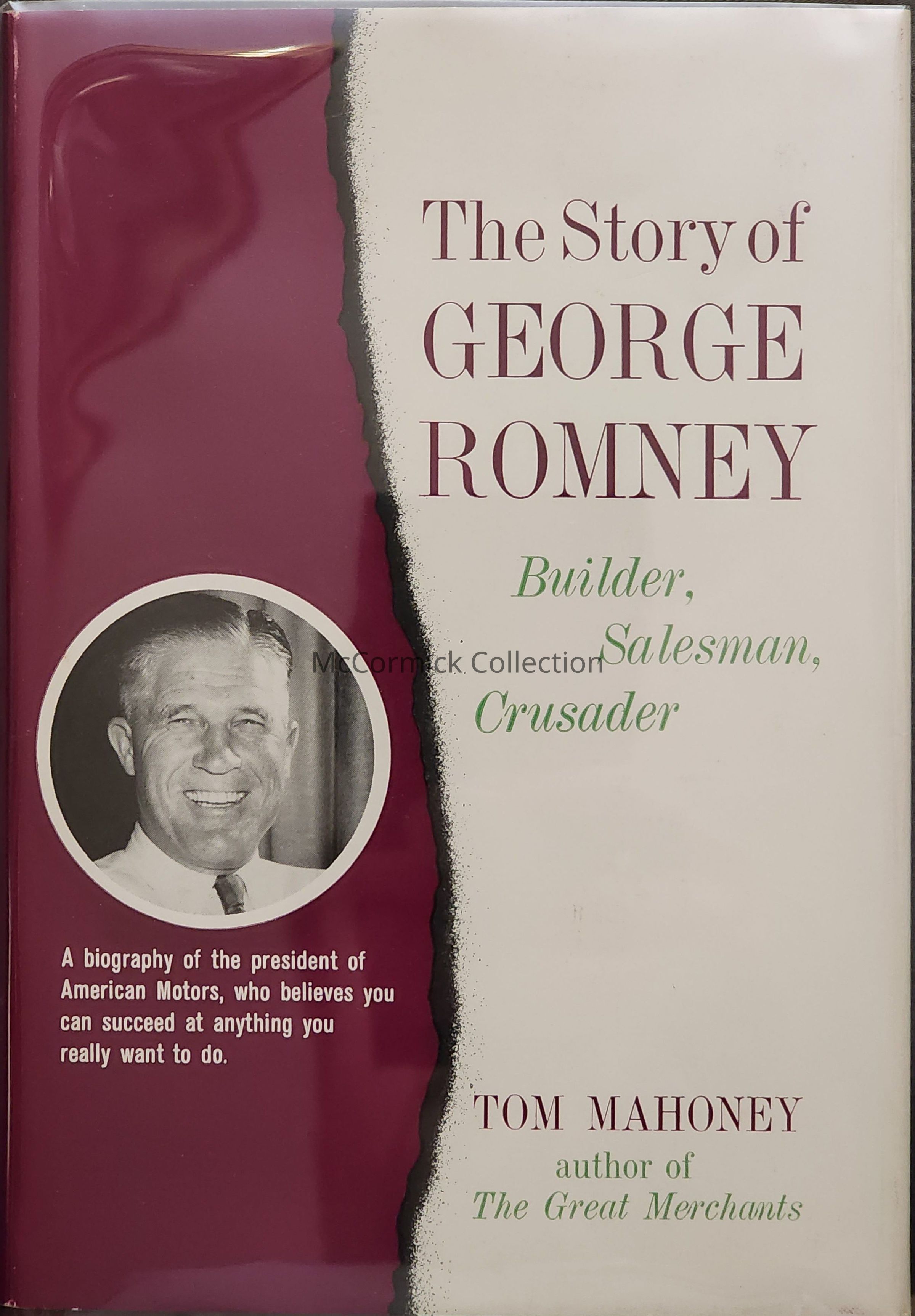 First edition of "The Story of George Romney: Builder, Salesman, Crusader" by Tom Mahoney (1960). This copy belonged to and is inscribed to Gil Wanger, a Lansing delegate to the 1961-1962 Michigan Constitutional Convention, for which Romney was a vice president and Wanger was the youngest Republican Delegate. Wanger is the last surviving Delegate to Con Con.