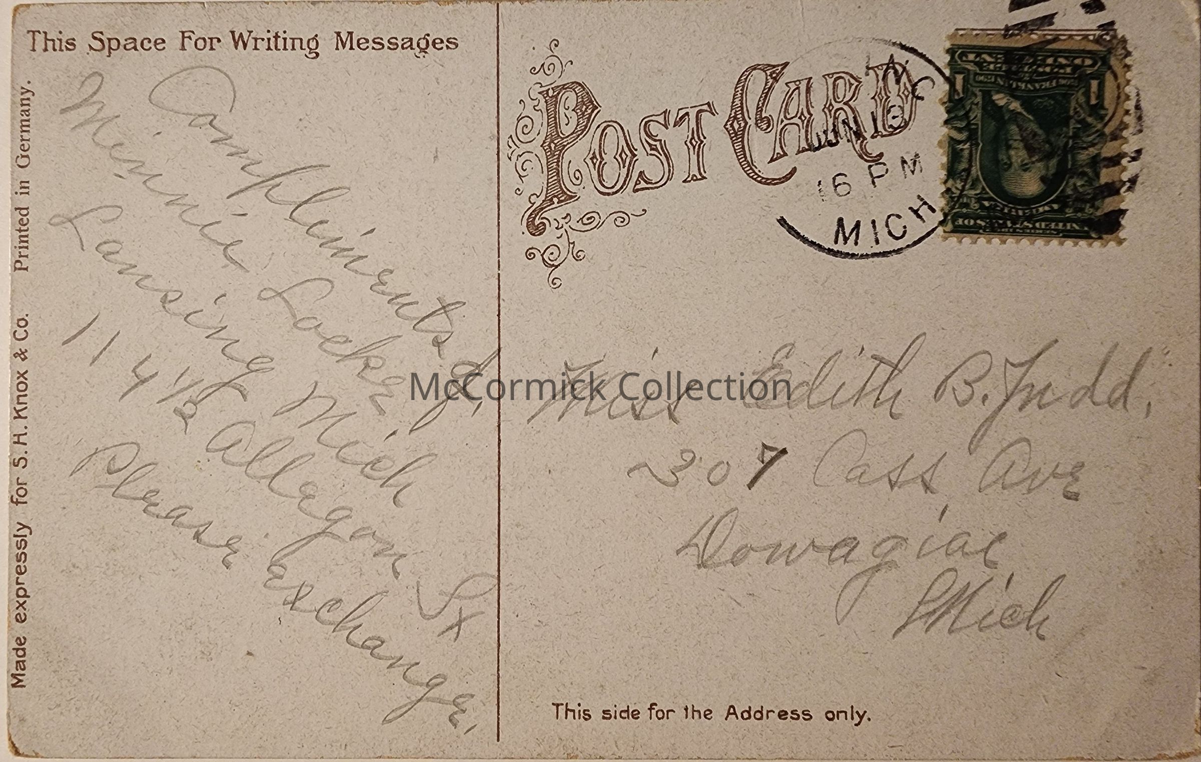 Published by S.H. Knox of Lansing. Postally used, Lansing postmark.
