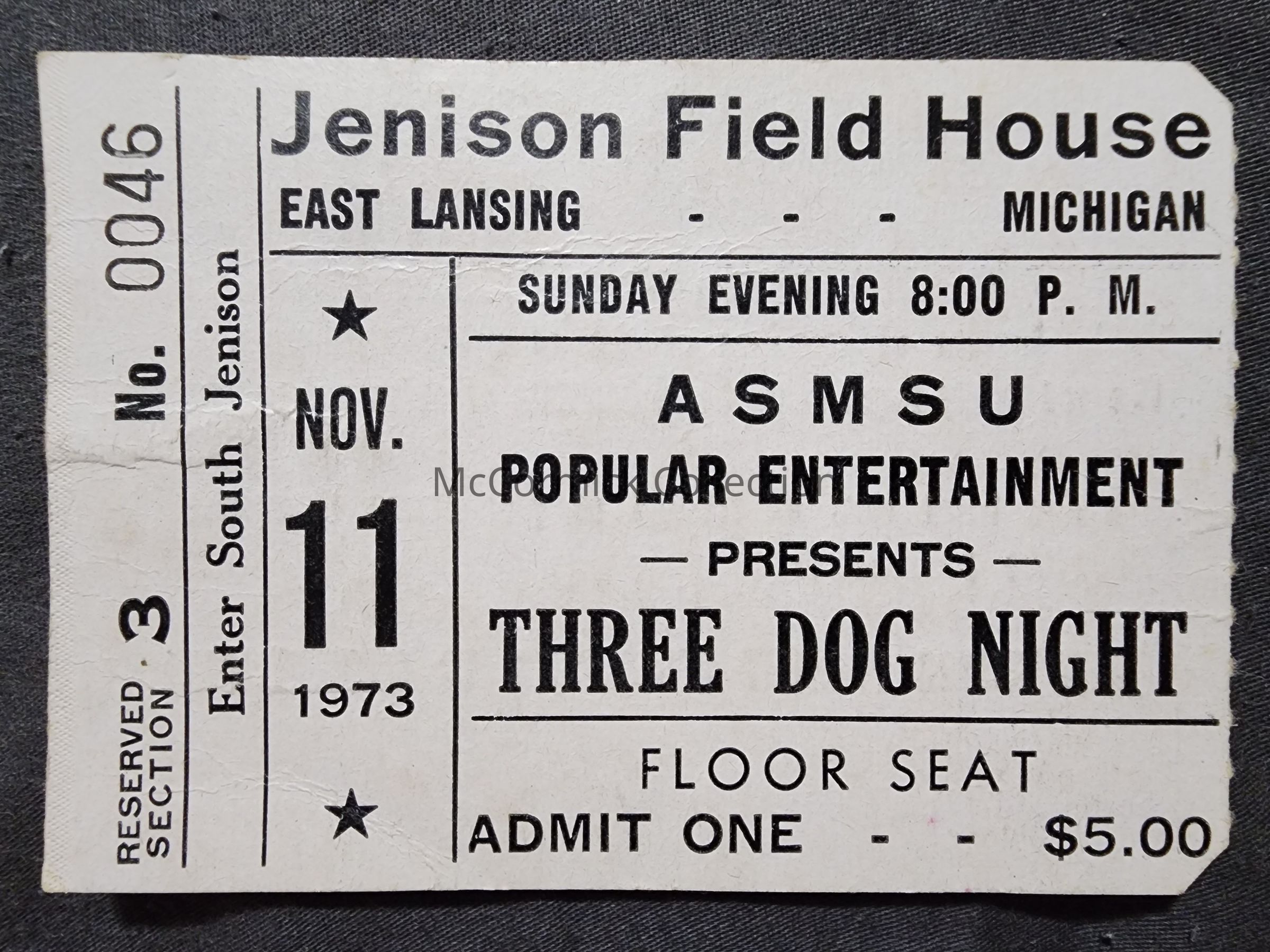 Ticket stub from the November 11, 1973 ASMSU concert of Three Dog Night at Jenison Field House at Michigan State University.