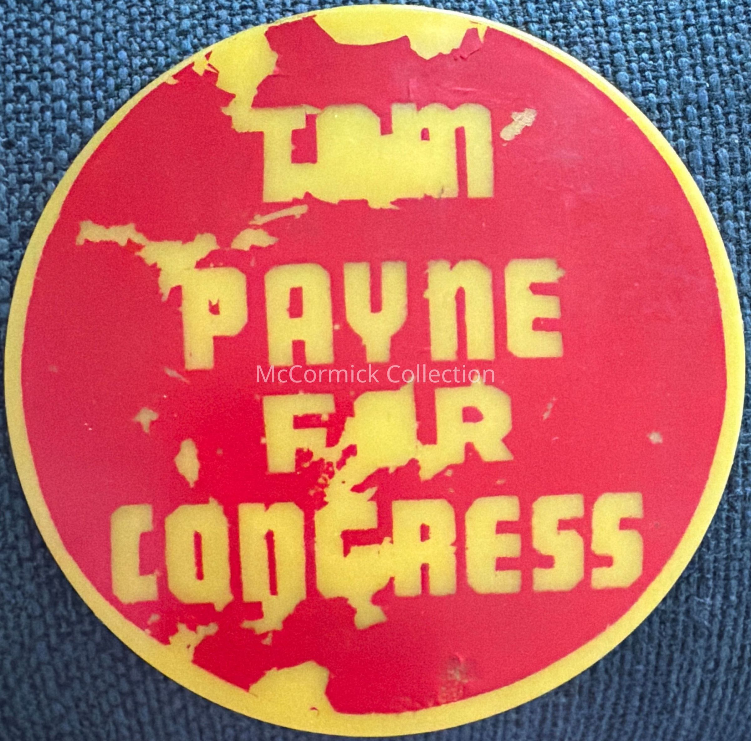A 3.25” red and yellow plastic pinback for Tom Payne for Congress.