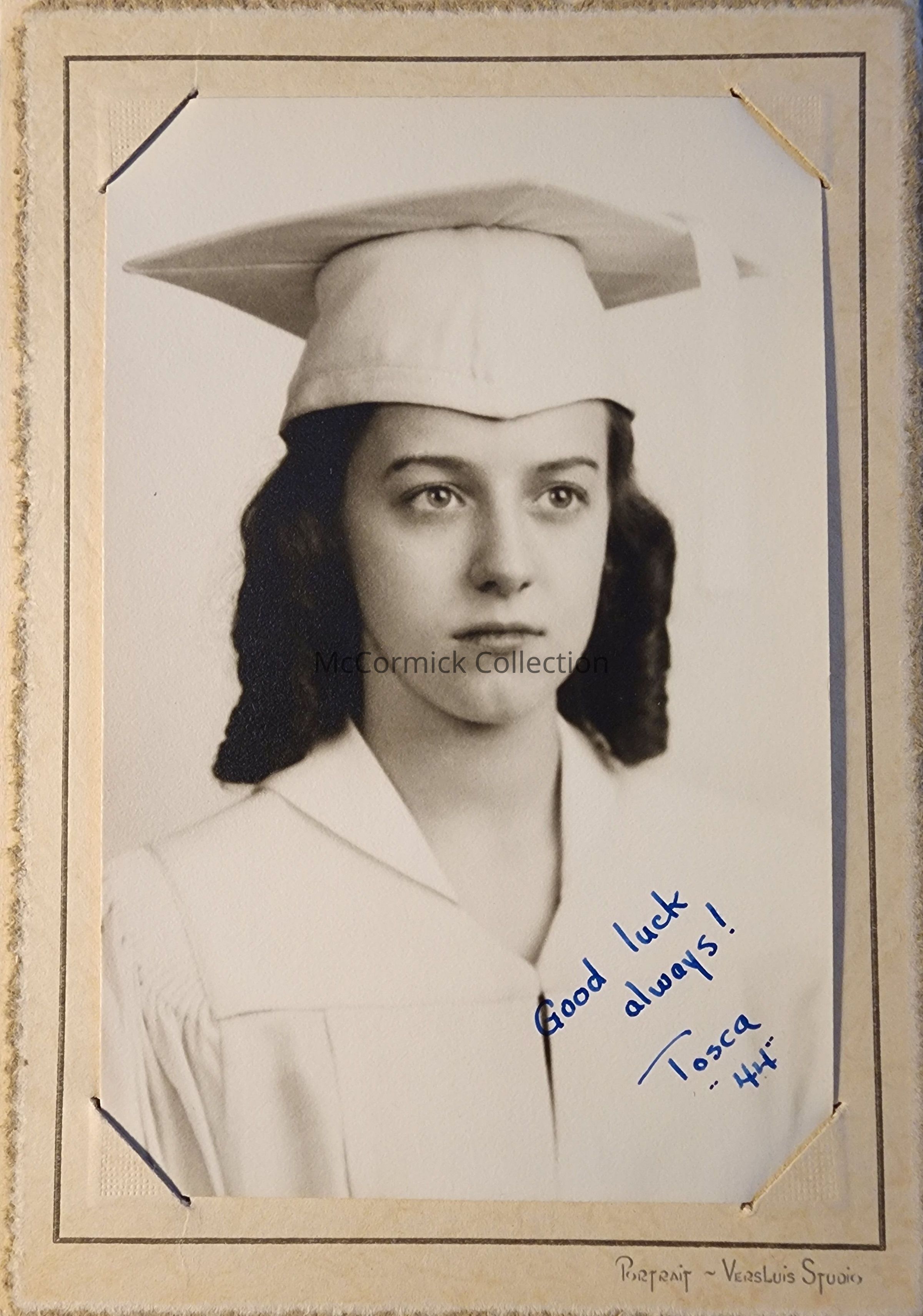 Folder frame mounted photograph of Tosca E. Albera, class of 1944, by photographer Versluis. She was from Battle Creek, likely taken by Versluis studio there.