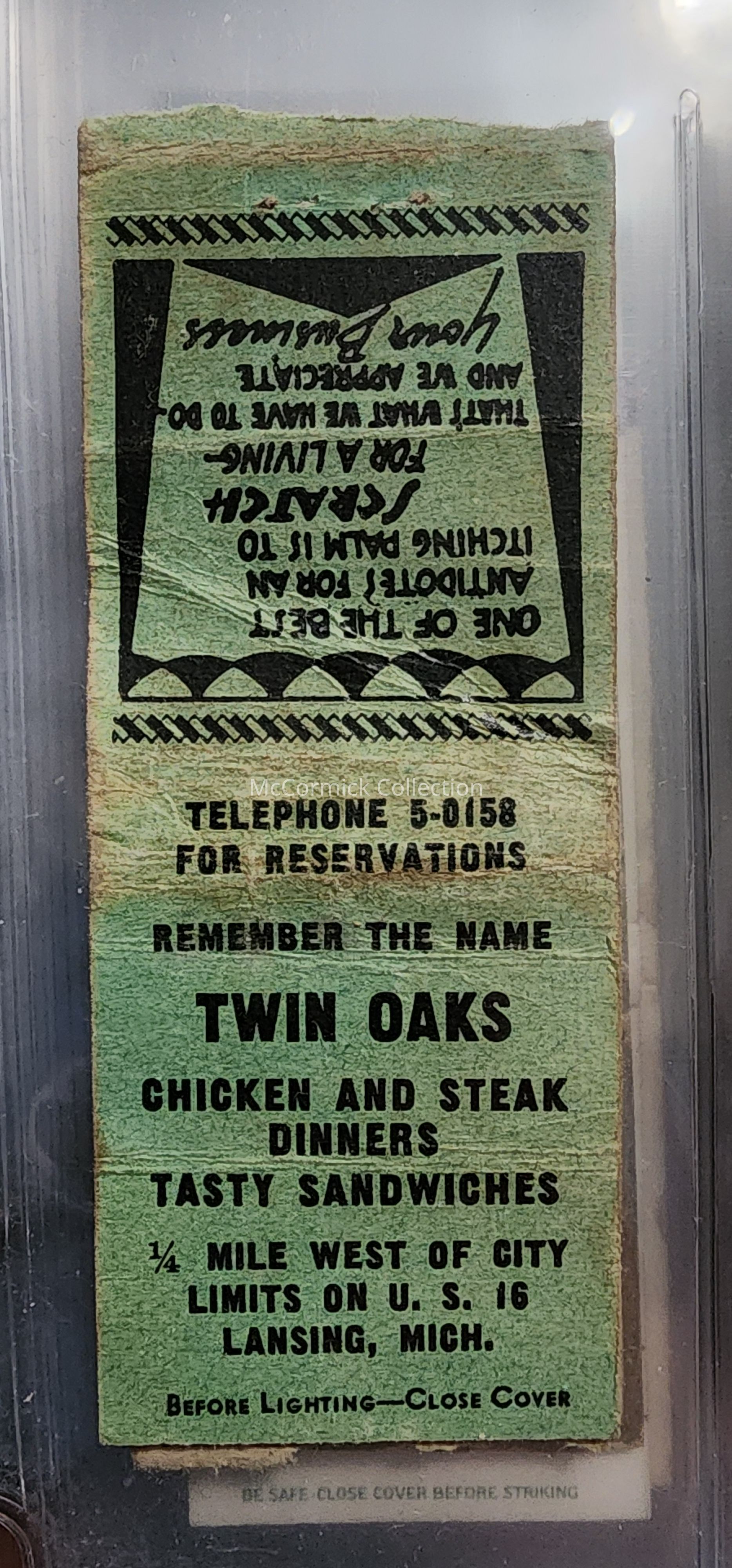 Twin Oaks Chicken and Steak Dinners, Lansing, Mich. Matchbook