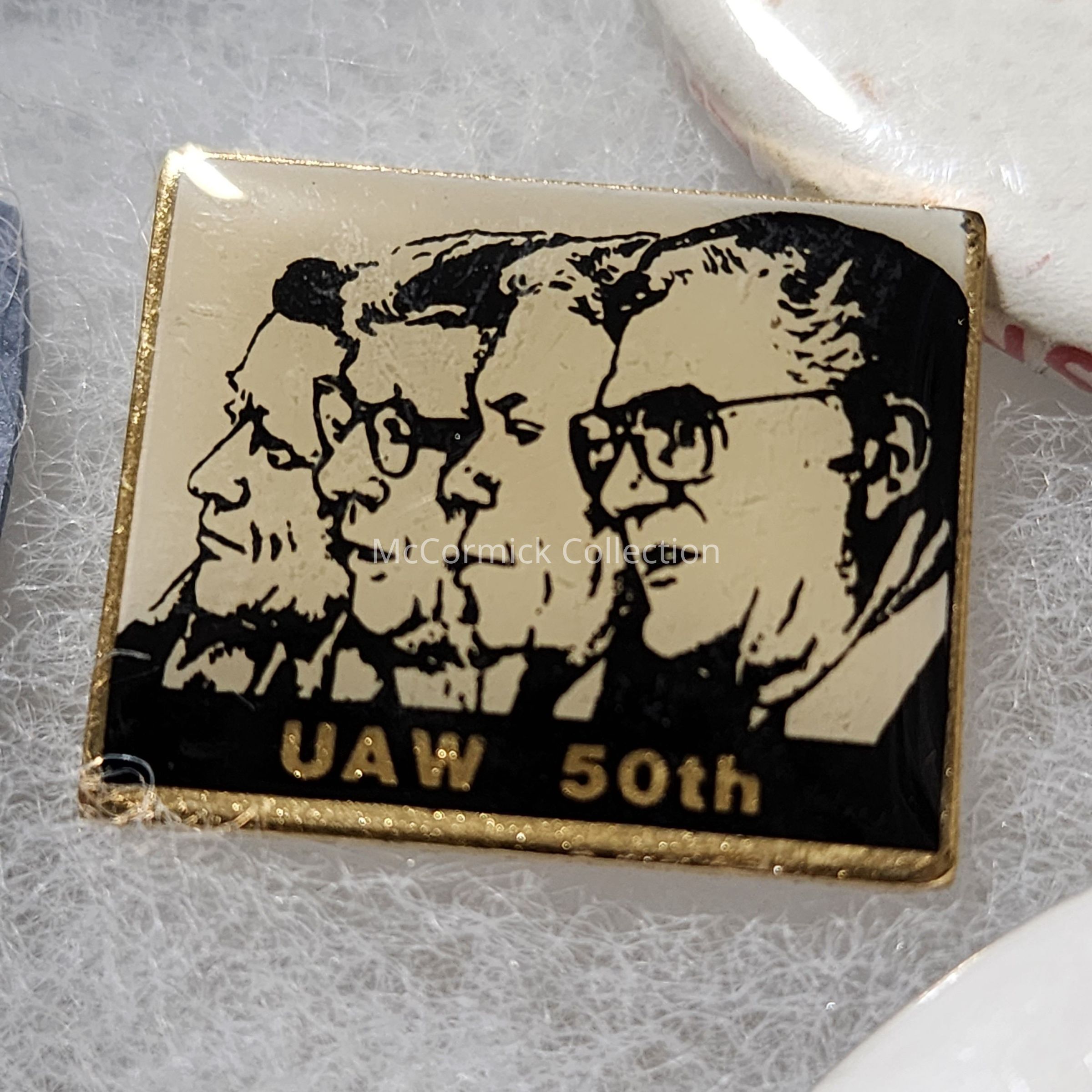A small pinback featuring four faces from UAW history, including Walter Reuther, for UAW's 50th anniversary.