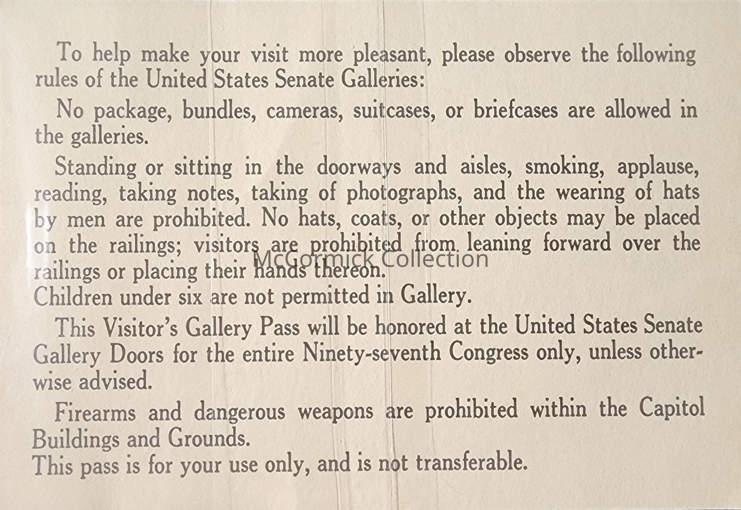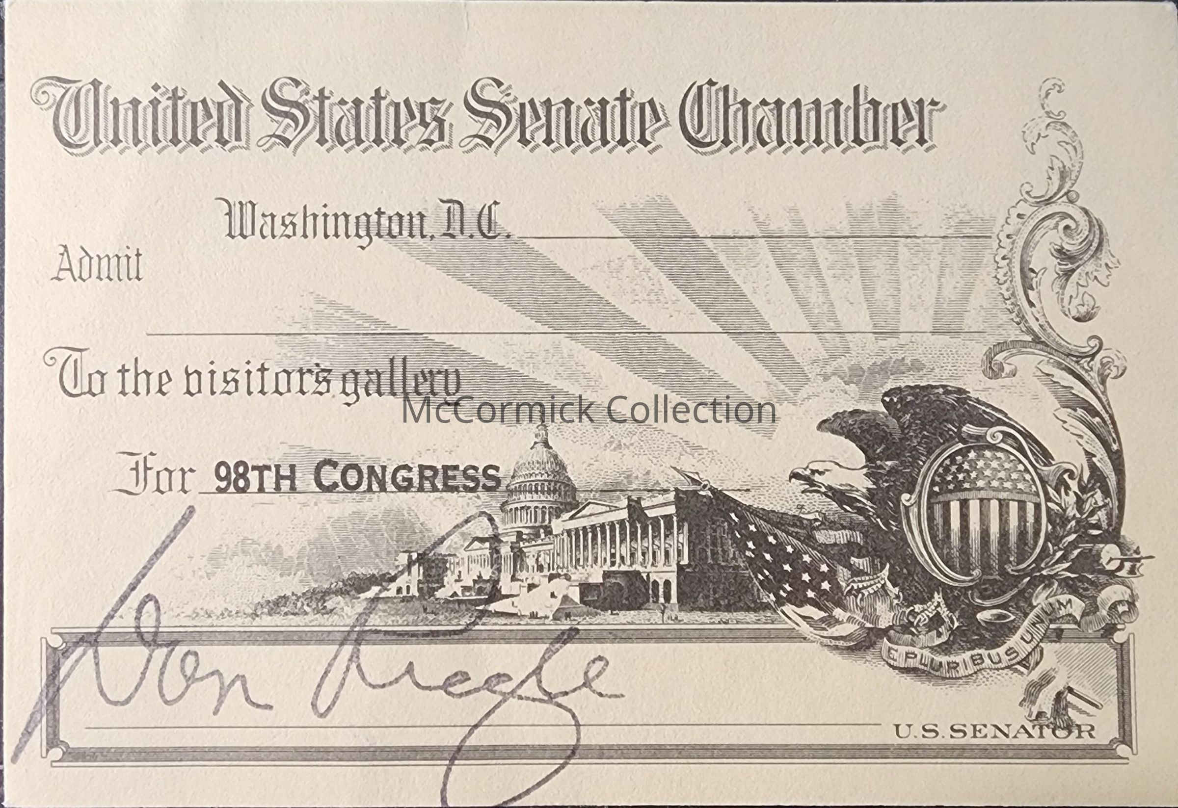 United States Senate Chamber pass from Michigan Senator Don Riegle, 98th Congress, 1983-1985.
