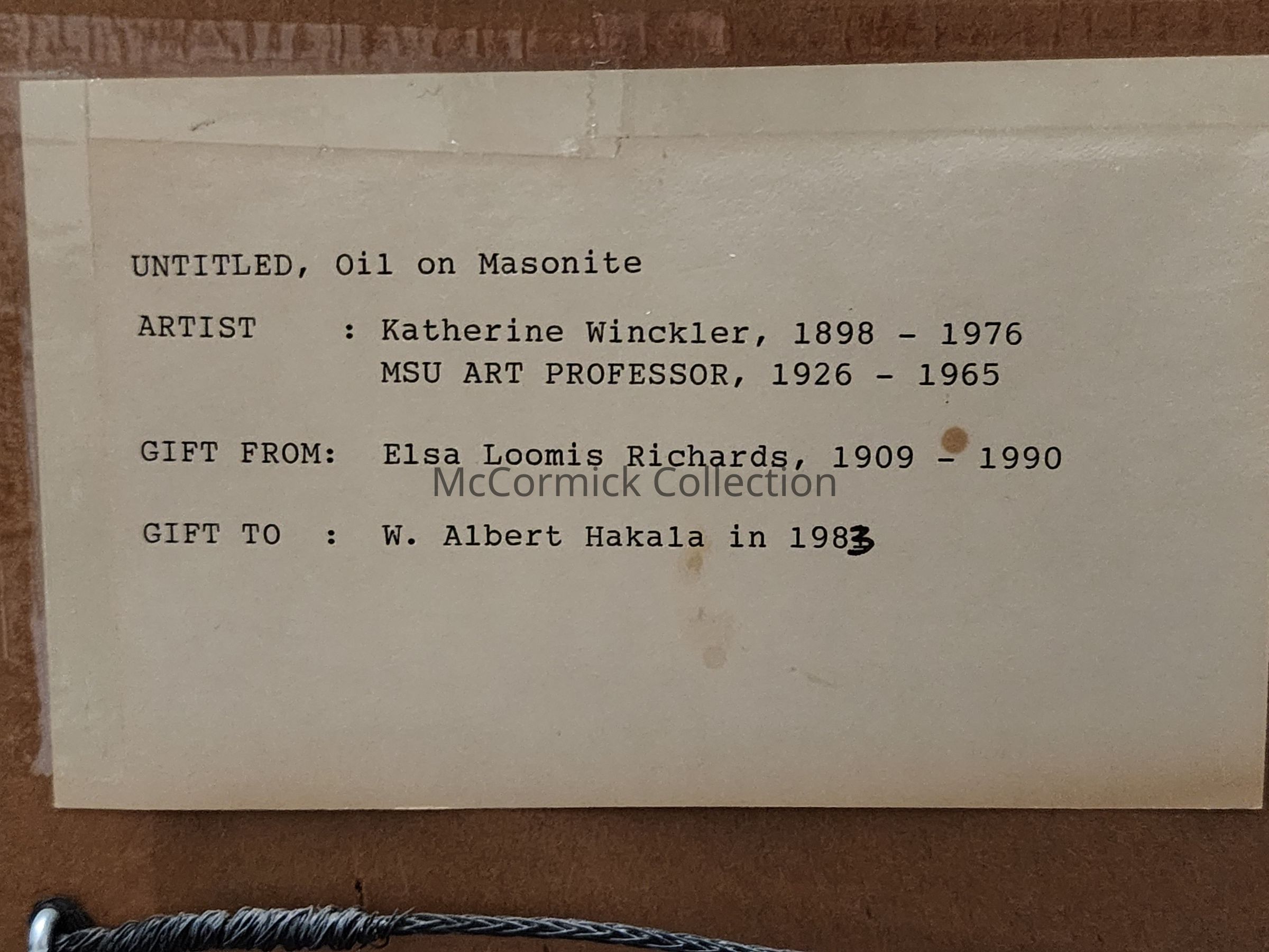 Untitled abstract oil on Masonite board by East Lansing artist Katherine Winckler (1898-1976), art professor at Michigan State College/University from 1926 to 1965. Winckler, together with fellow artist and MSC faculty Alma Goetsch, commissioned the Goetsch-Winckler House from Frank Lloyd Wright in Okemos, Michigan.