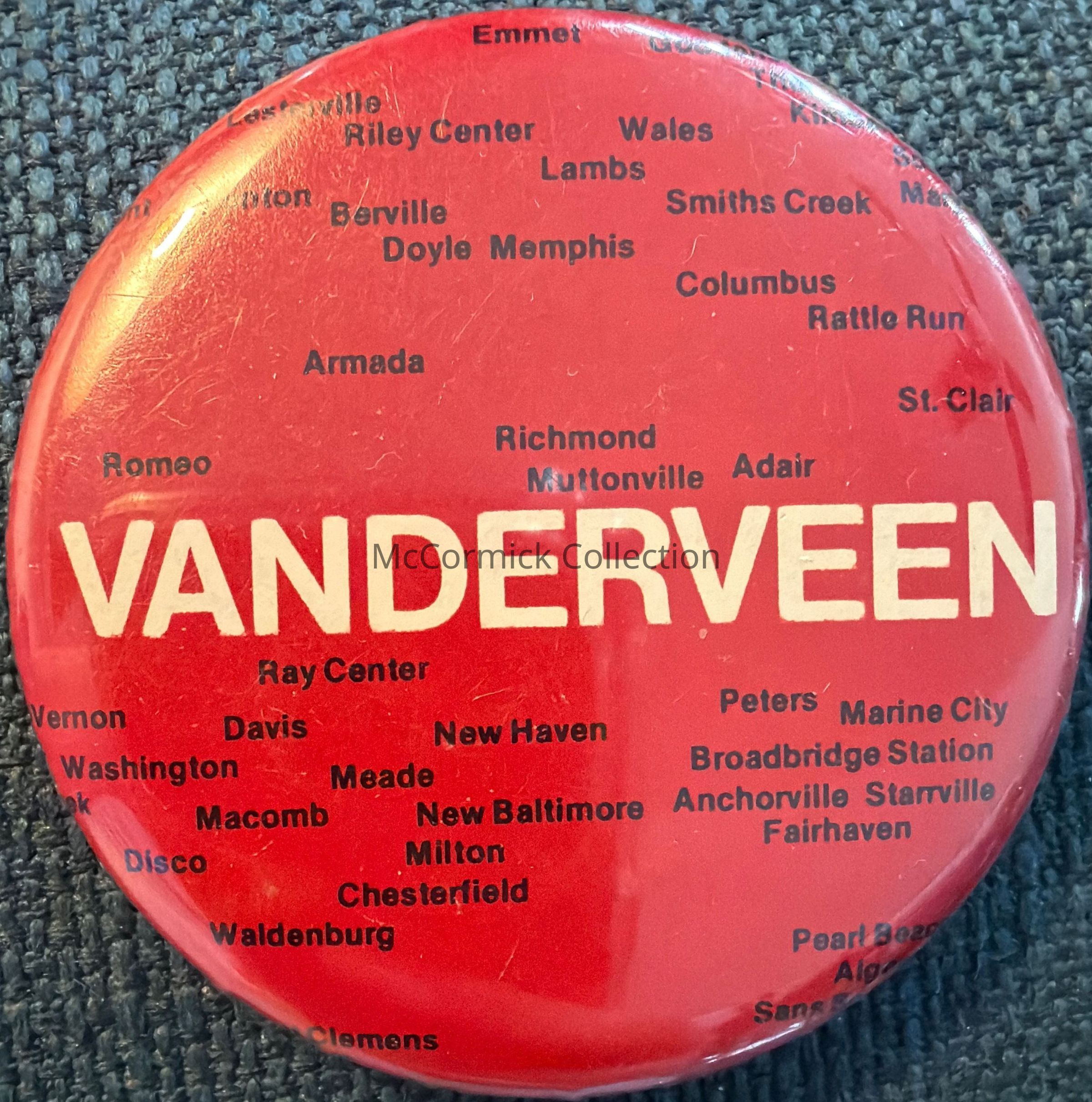A 2.25” red, white, and black political button for Dick Vanderveen for U.S. Senate, 1978 primary.