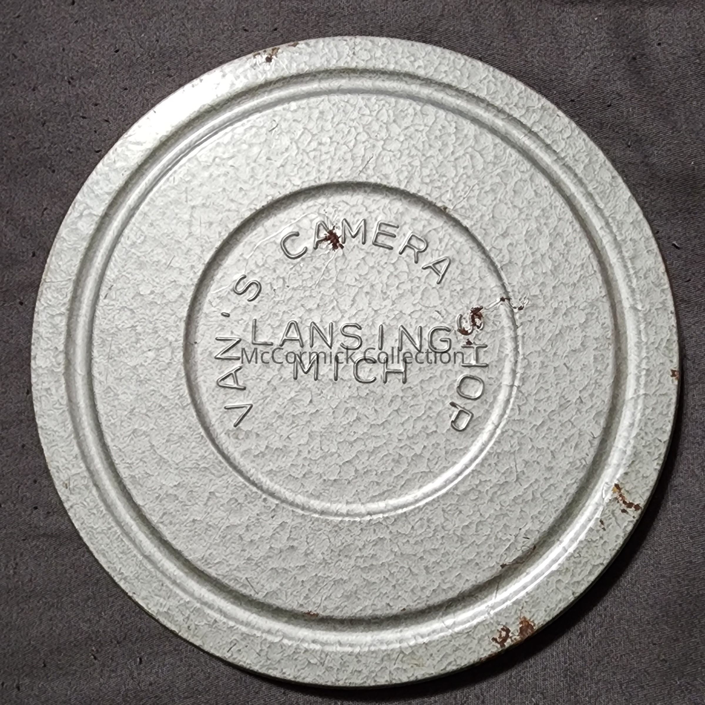 Film reel and metal cannister from Van's Camera Shop of Lansing. The film records traffic on Michigan Avenue and captures an auto accident. Circa 1950s.