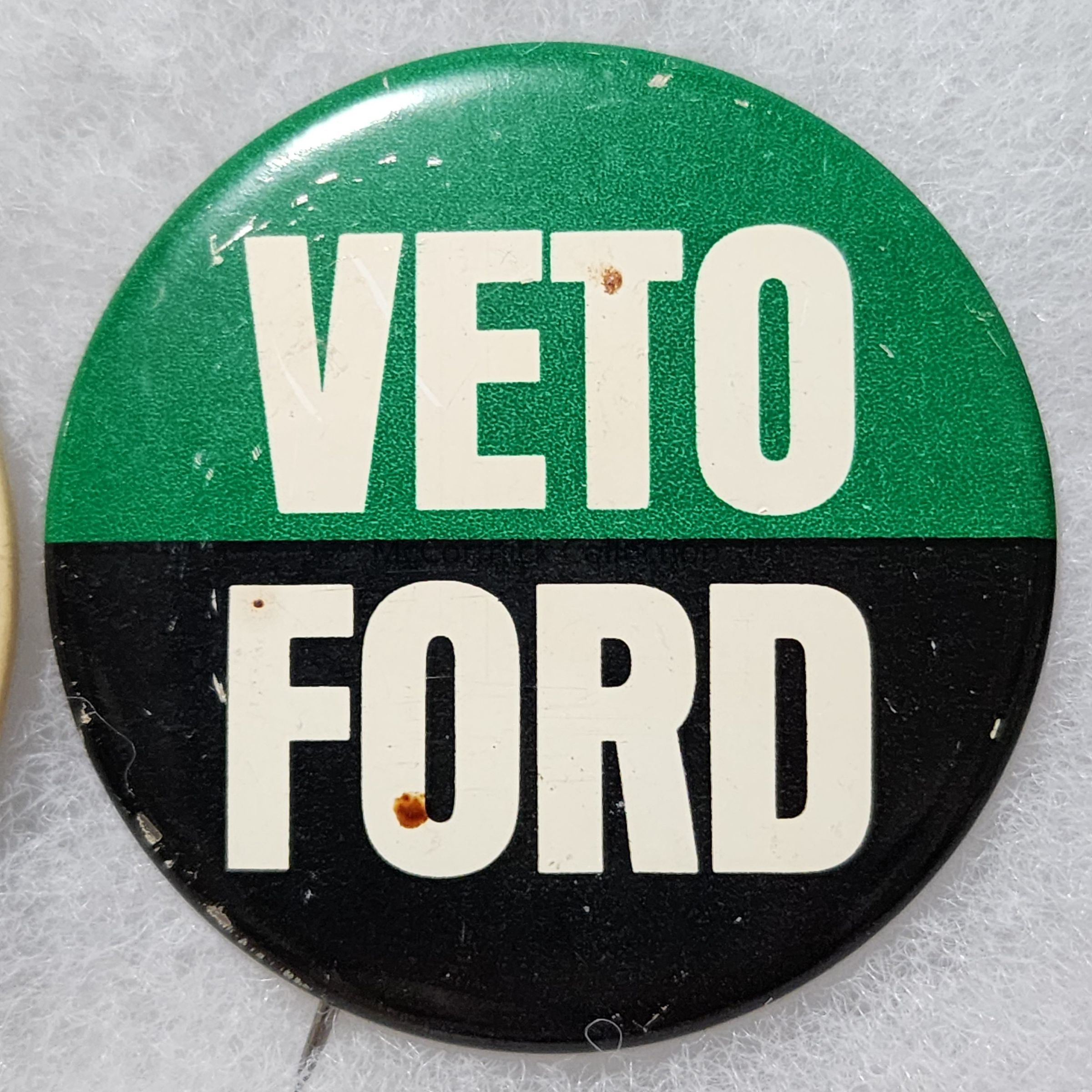 A 2" black, white, and green anti political button opposing Gerald Ford for president, c. 1976.