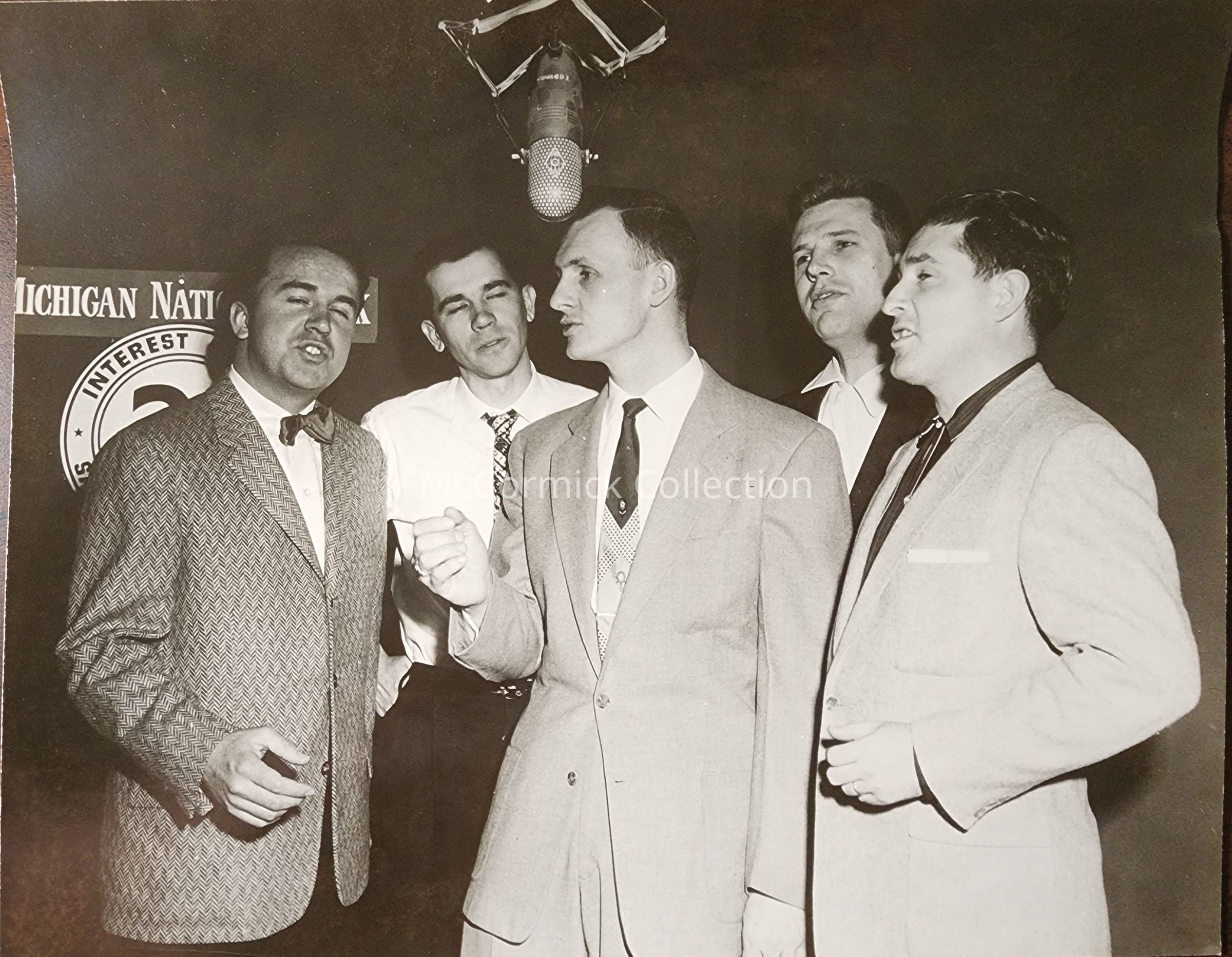 Photograph of a vocal quintet in a dark studio room with Michigan National Bank advertising behind them. Related to Russell Siebert. From Siebert Estate.