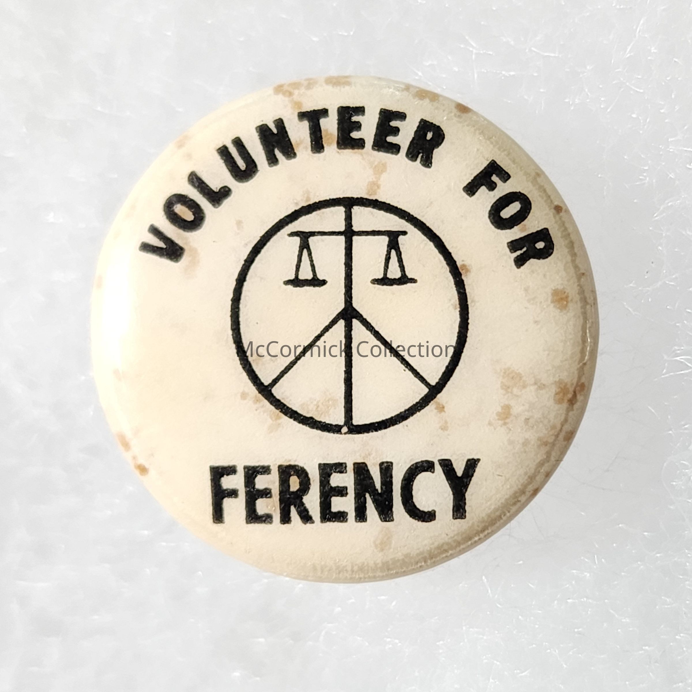 Political campaign button for Zolton Ferency, likely his 1966 Michigan gubernatorial campaign. Peace sign motif.