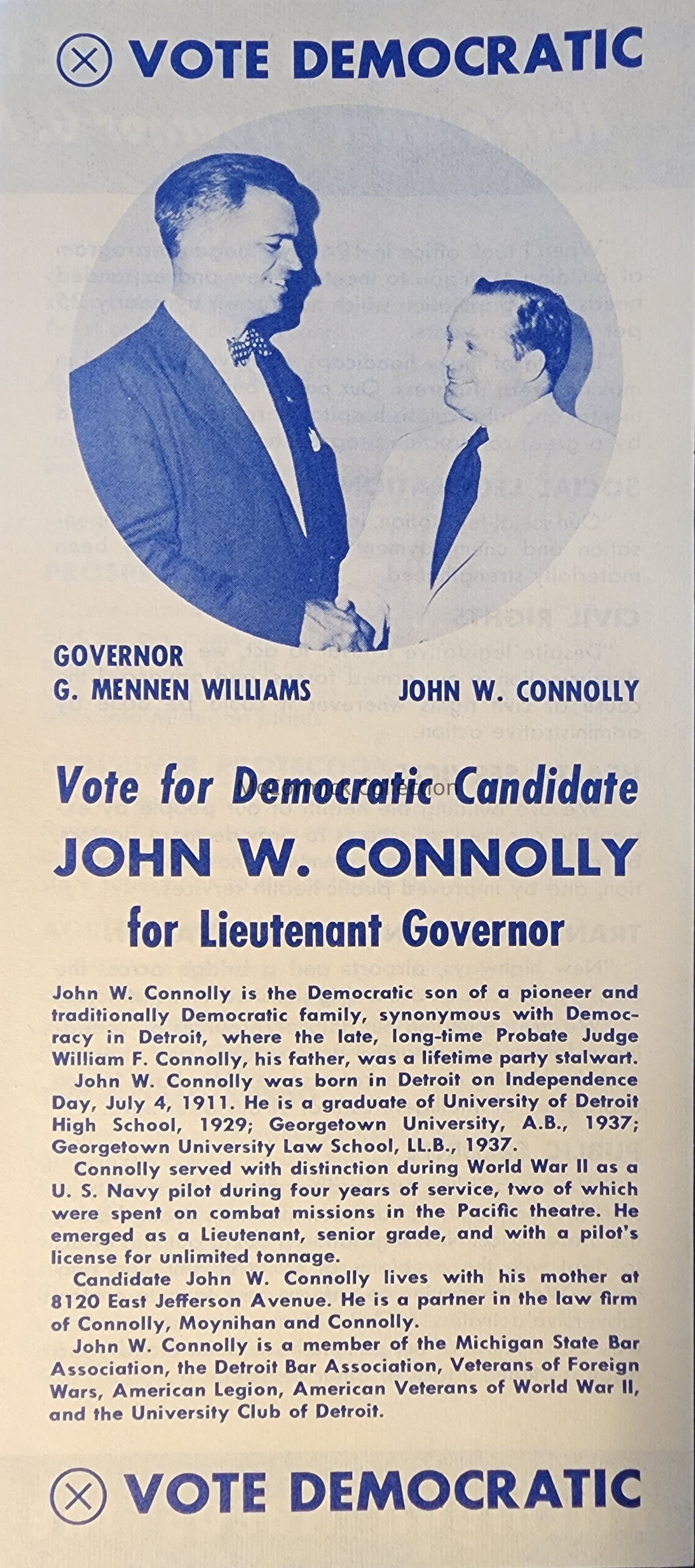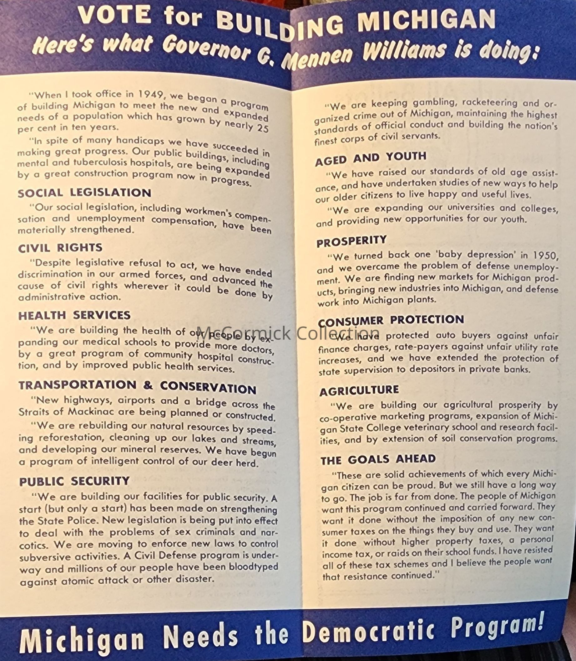 Coattail pamphlet with Governor G. Mennen Williams. Circa 1950s.