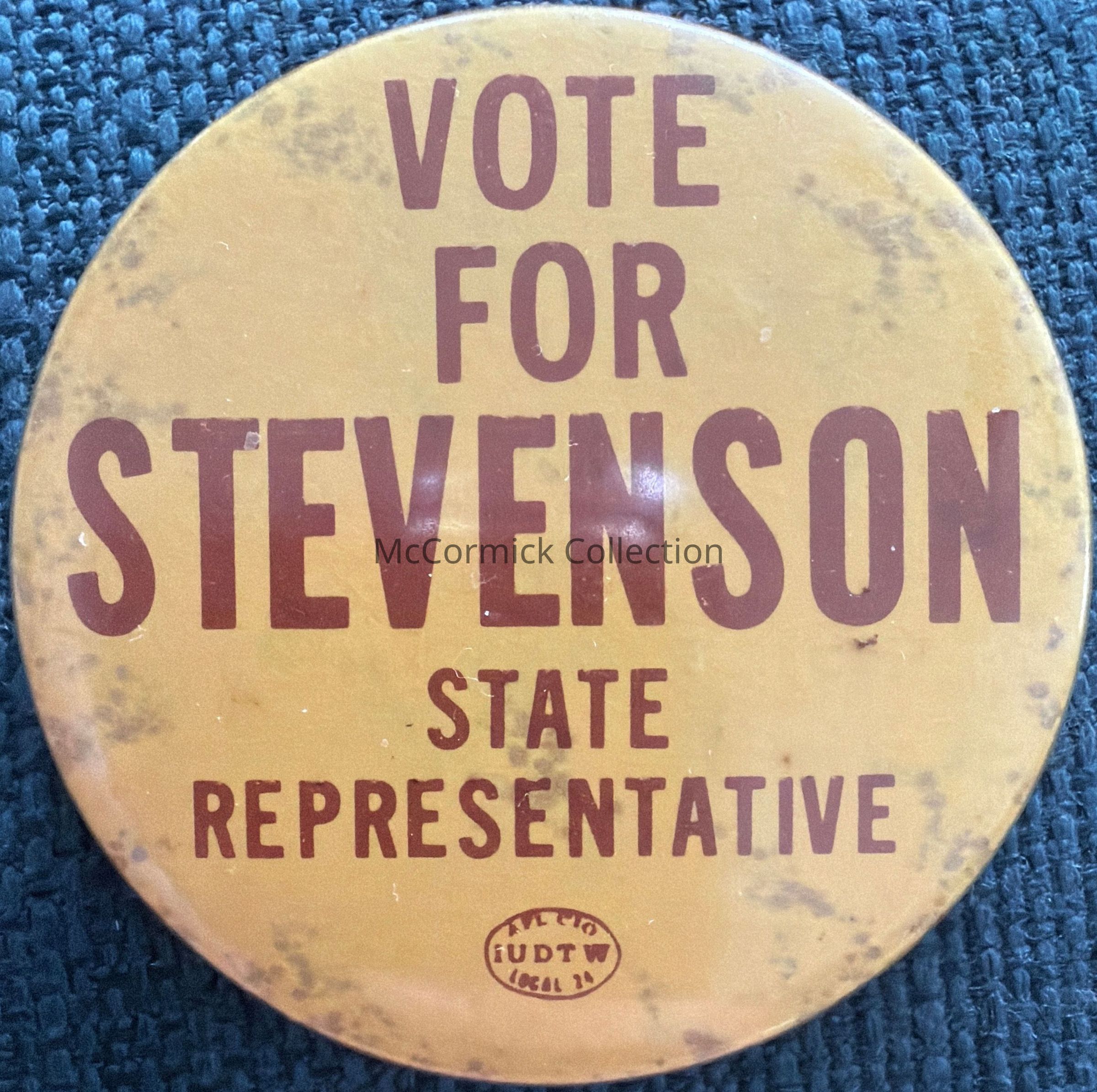 A 2” yellow and brown political button for Stevenson for State Representative.