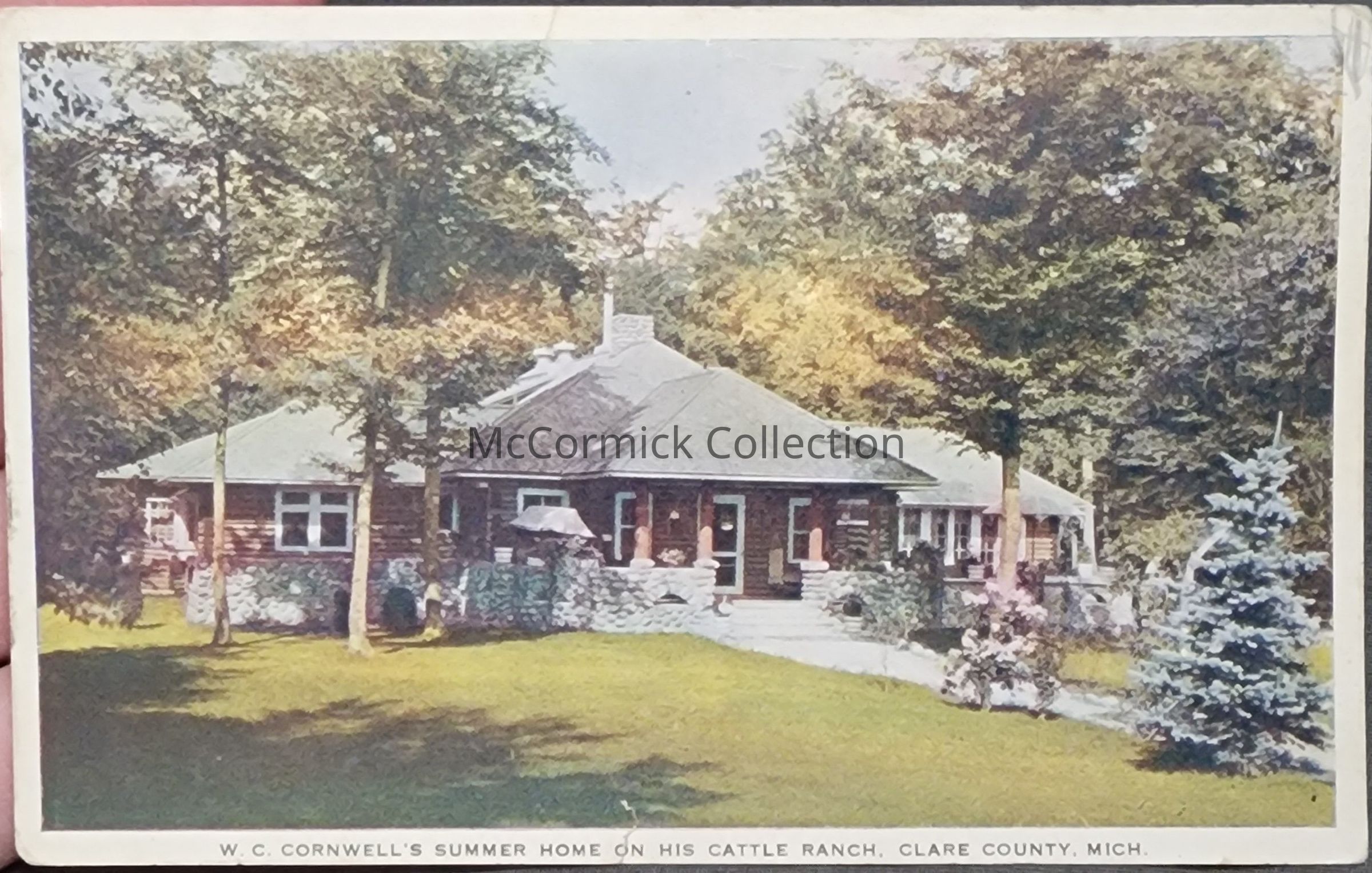 Postcard of W.C. Cornwell's summer home at the Cornwell Ranch between Clare and Harrison, Michigan. Postally used, postmarked Clare, 1938.