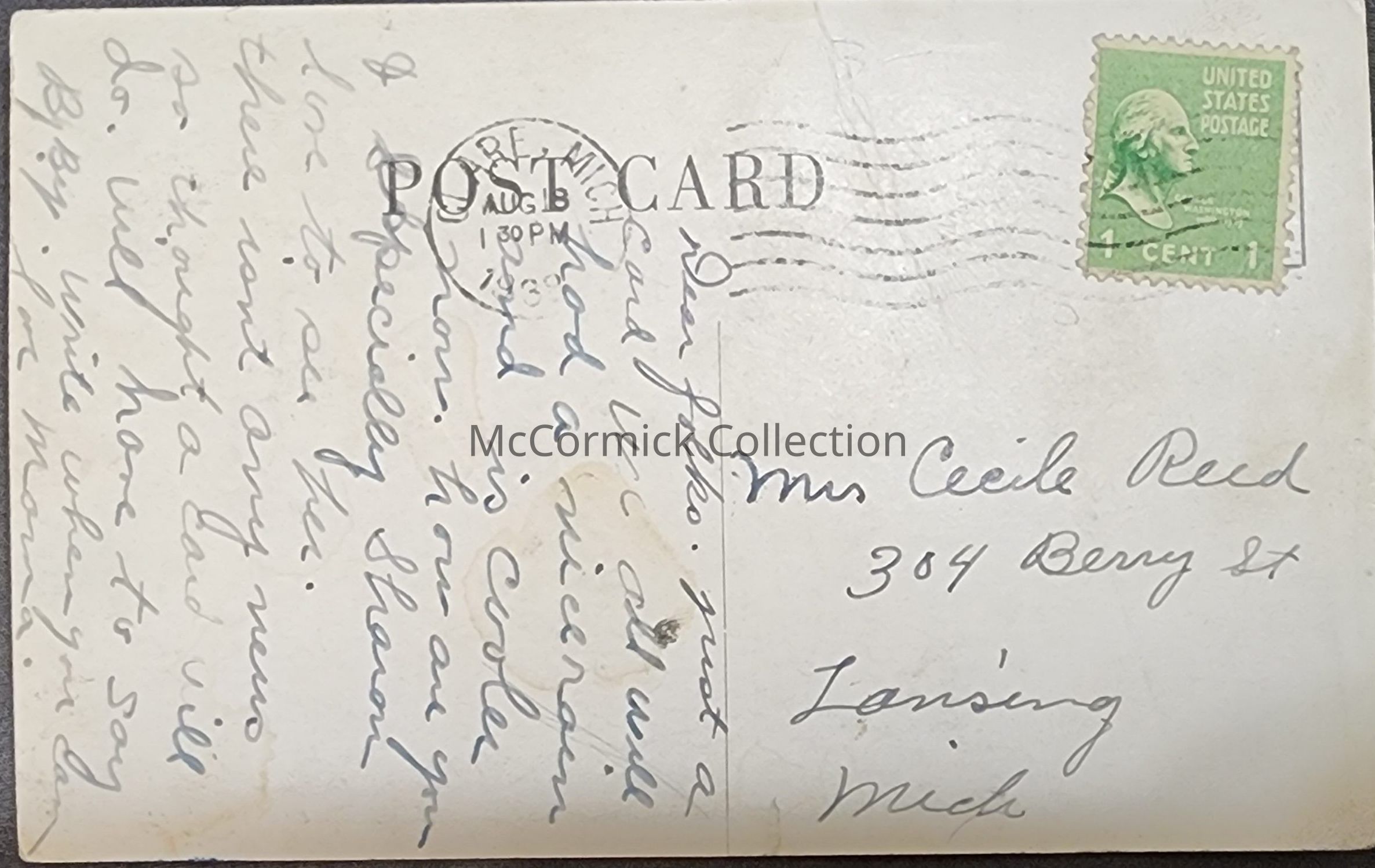 Purchased at the Okemos, Michigan, postcard show. Addressed to Cecile Reed (my great grandmother) from her mother, signed "love mama."