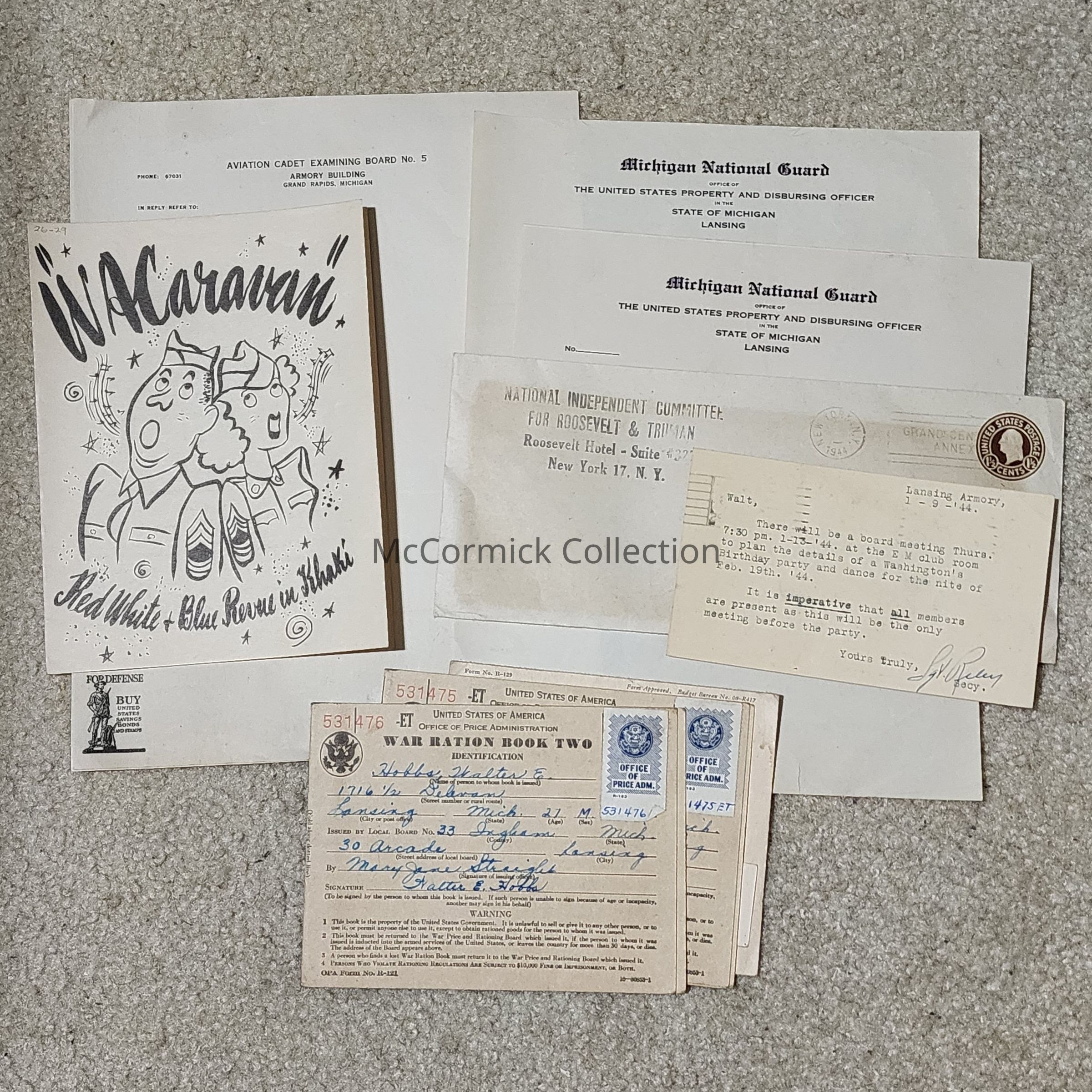 Collection of ephemera tied to Lansing resident Walter Hobbs and the World War Ii era. Includes two pieces of Michigan National Guard letterhead, two pieces of Aviation Cadet Examining Board letterhead, war ration books, 1944 postcard for meeting held at Lansing Armory, program for WACaravan musical, and a 1944 envelope from the National Independent Committee for Roosevelt & Truman containing an address of Dorothy Thompson.