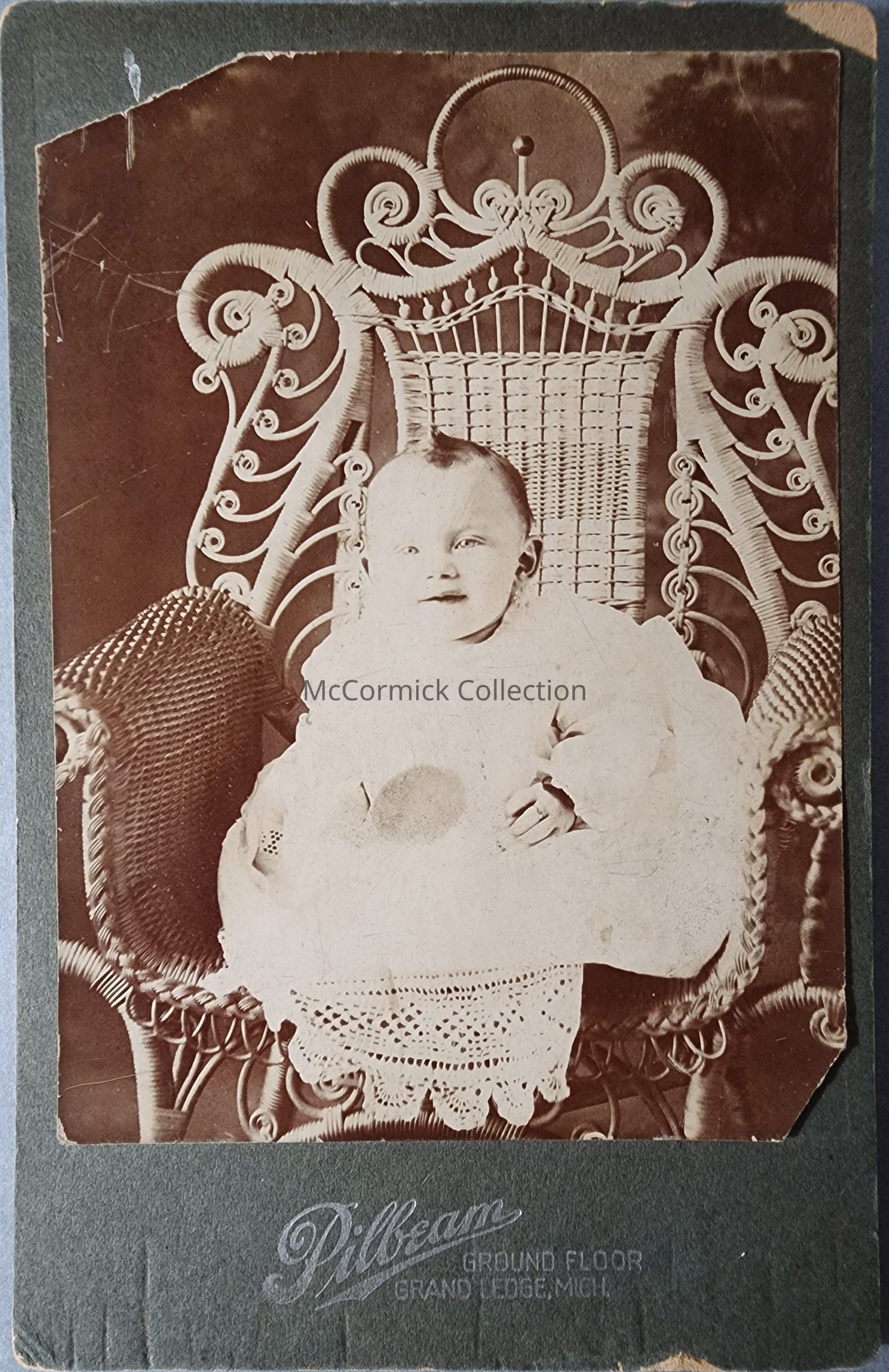 Cabinet card photograph of infant Walter Shroeder by Pilbeam of Grand Ledge. Pilbeam also worked in Lansing.