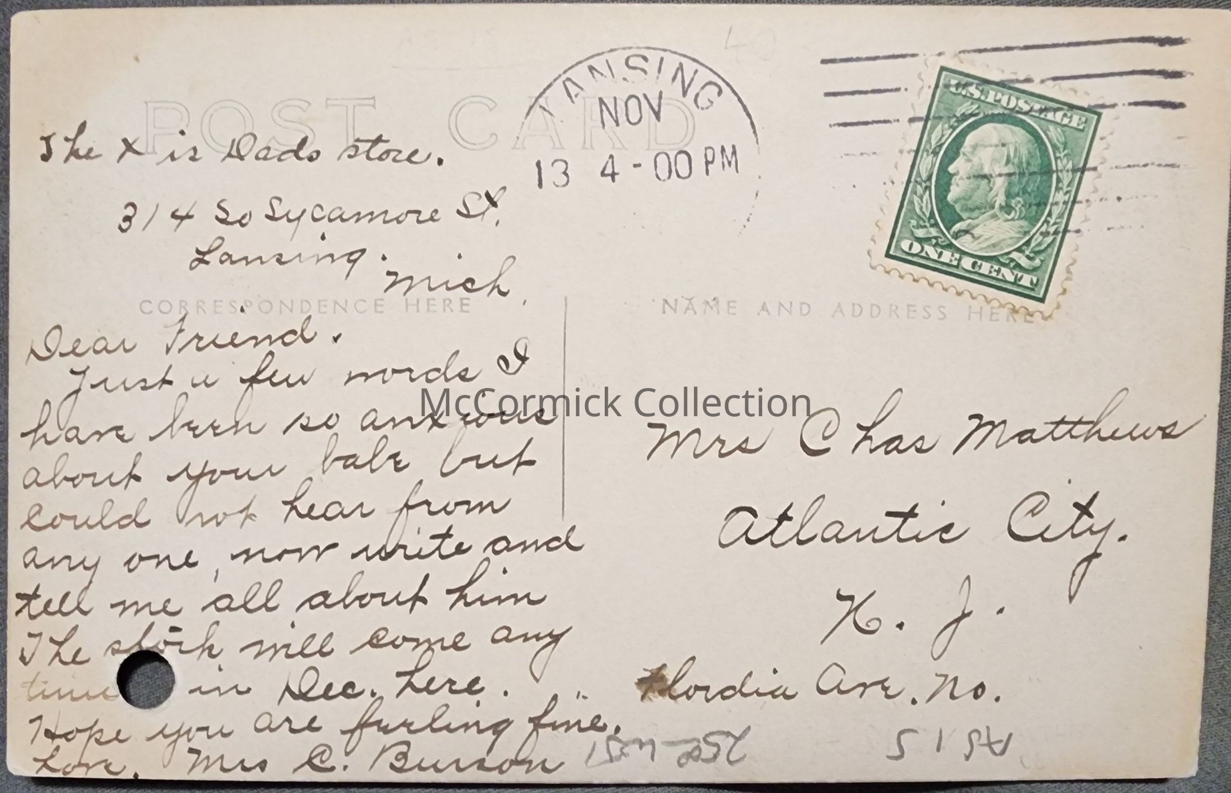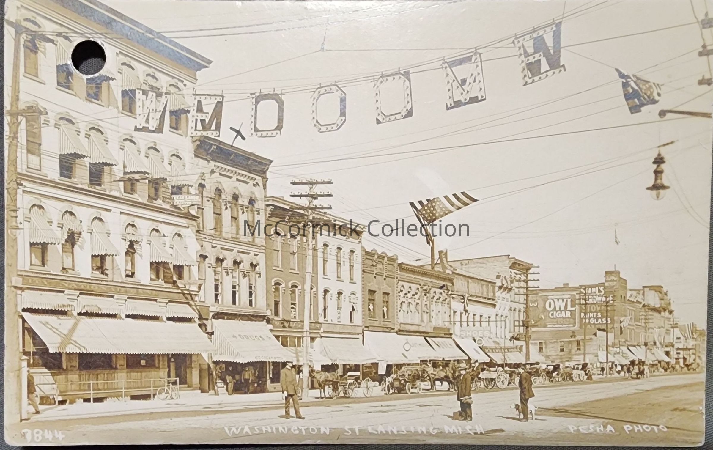 Real photo postcard of Washington Avenue in Lansing, showing a business district and the Welcome sign across the road. Photo by noted Michigan photographer Louis Pesha.