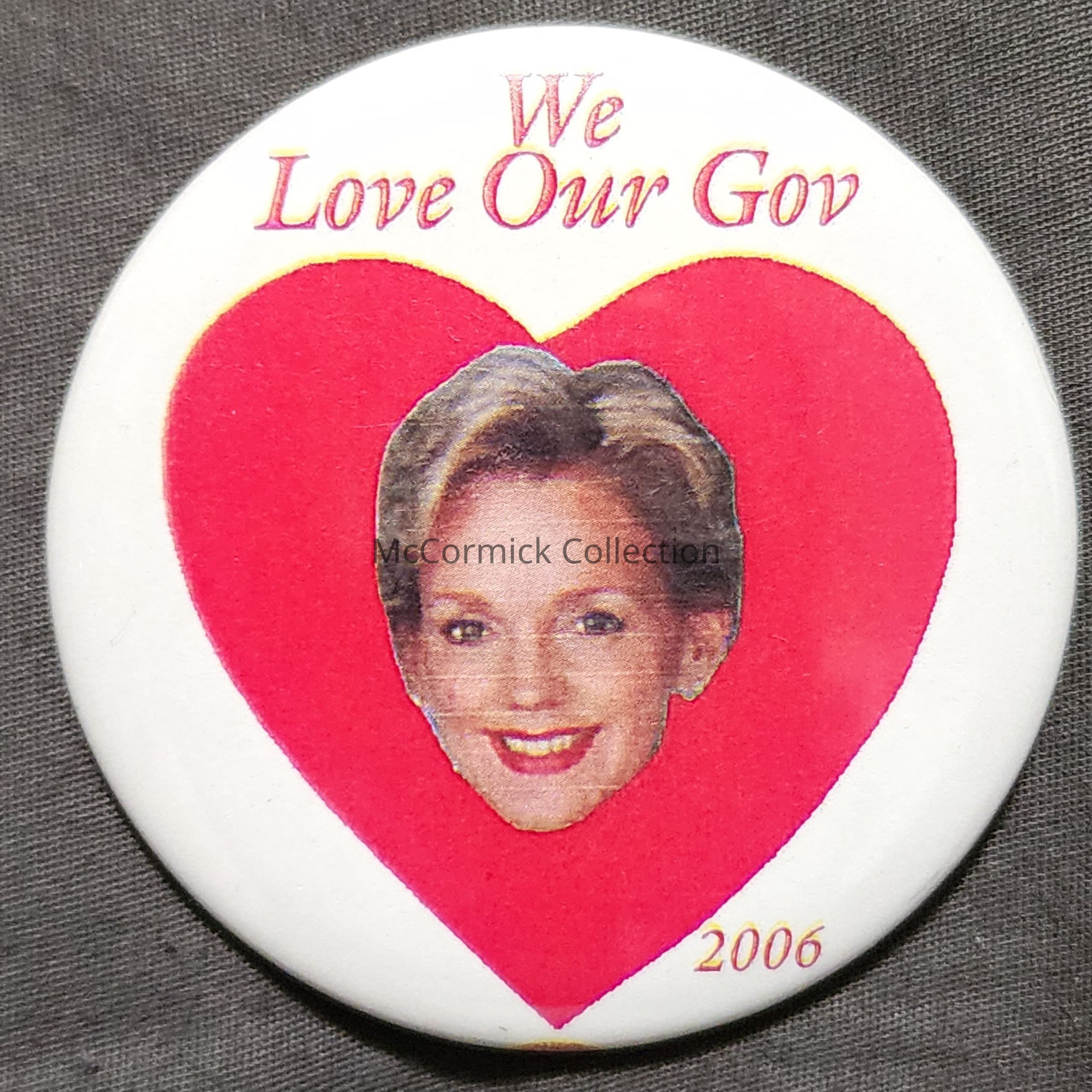 A 2.25" political button for Jennifer Granholm for Governor of Michigan, featuring a red heart and a floating head of Granholm with the phrase "We Love Our Gov." Dated 2006.