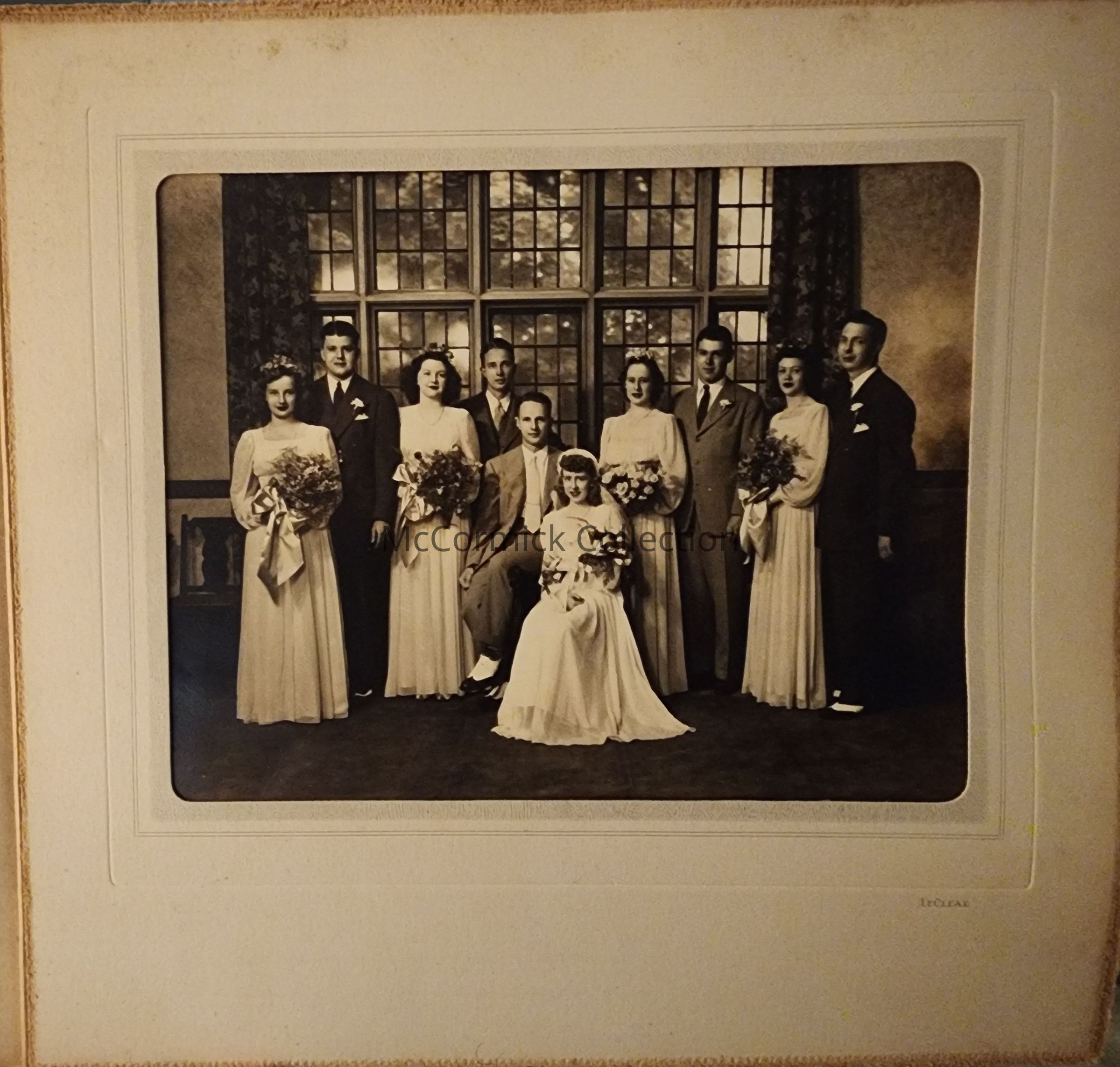 Folder mounted photograph of an unidentified wedding party by Lansing photographer LeClear.